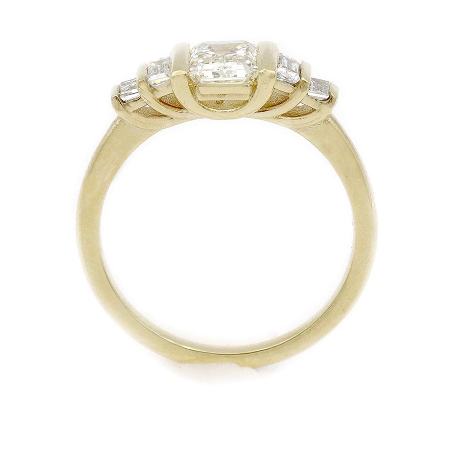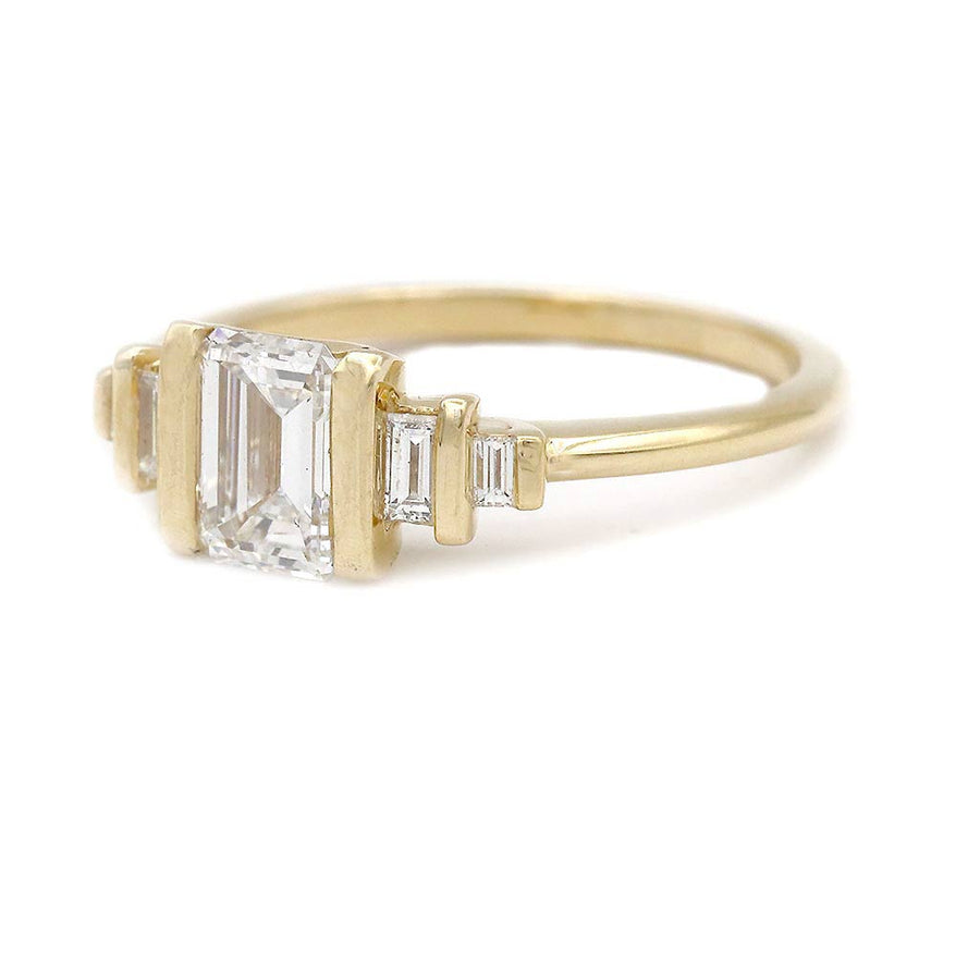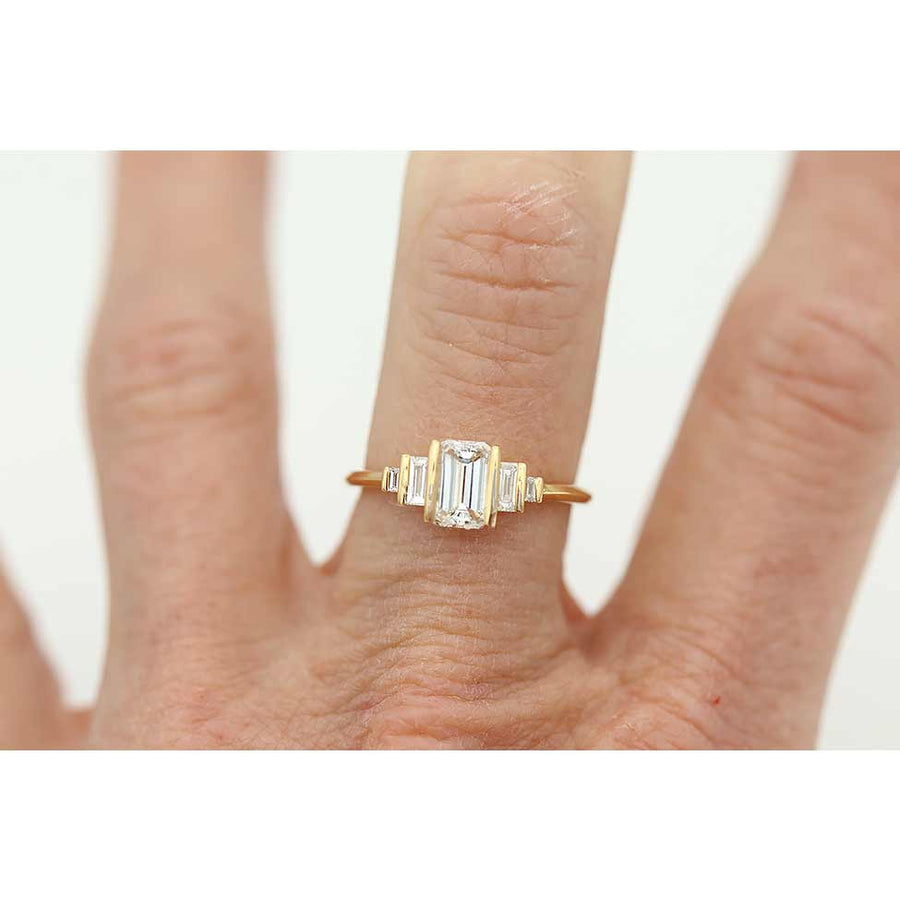 The Lia ring is an Art Deco–style engagement ring featuring an authentic .81 carat GIA emerald cut diamond, graded D color and SI1 clarity. The center stone is bar-set and flanked by four vintage baguette cut diamonds, creating a crisp, linear look inspired by classic Art Deco design. Crafted in recycled 18 karat yellow gold, this ring was made in New York City and is ready to ship.