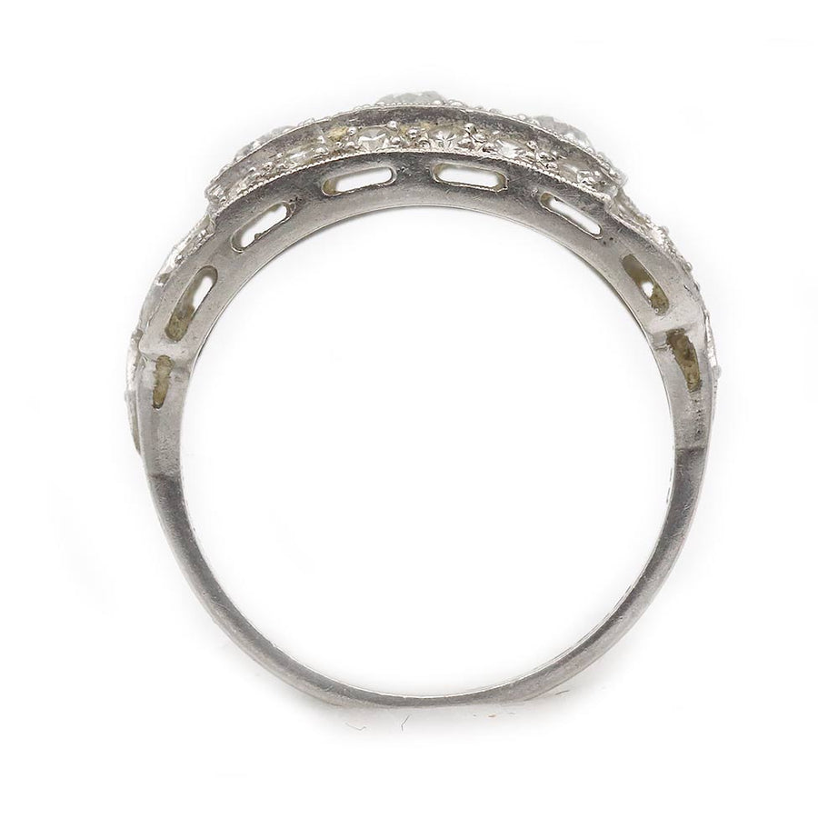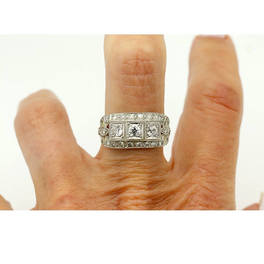 The Kelsea ring is an authentic Edwardian engagement ring dating to the 1920s. It features a trio of old European cut diamonds totaling approximately .50 carats, graded F color and VS2 clarity, each set within crisp geometric square frames. The center stones are surrounded by twenty-one single cut diamond accents that add light and refined sparkle. Beautifully crafted in platinum, the setting is finished with fine milgrain engravings characteristic of the period. A timeless and beautiful antique ring, preserved in very good condition.