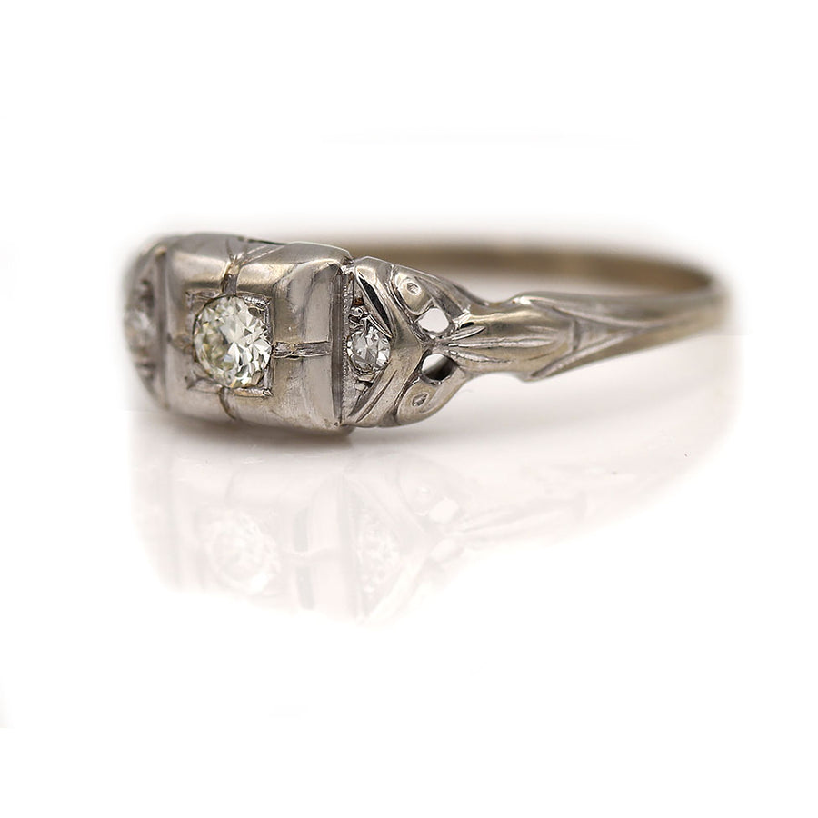 The Lisa A ring is an authentic vintage ring from the Art Deco era, dating to the 1920s. This dainty design centers a .12 carat old European cut diamond graded J color and VS2 clarity, set within a crisp geometric square frame. The center stone is flanked by two single cut diamond accents for subtle sparkle and balance. Beautifully crafted in 14 karat white gold, the ring is finished with delicate milgrain engraving. A classic and charming Art Deco jewel, offered in good vintage condition.