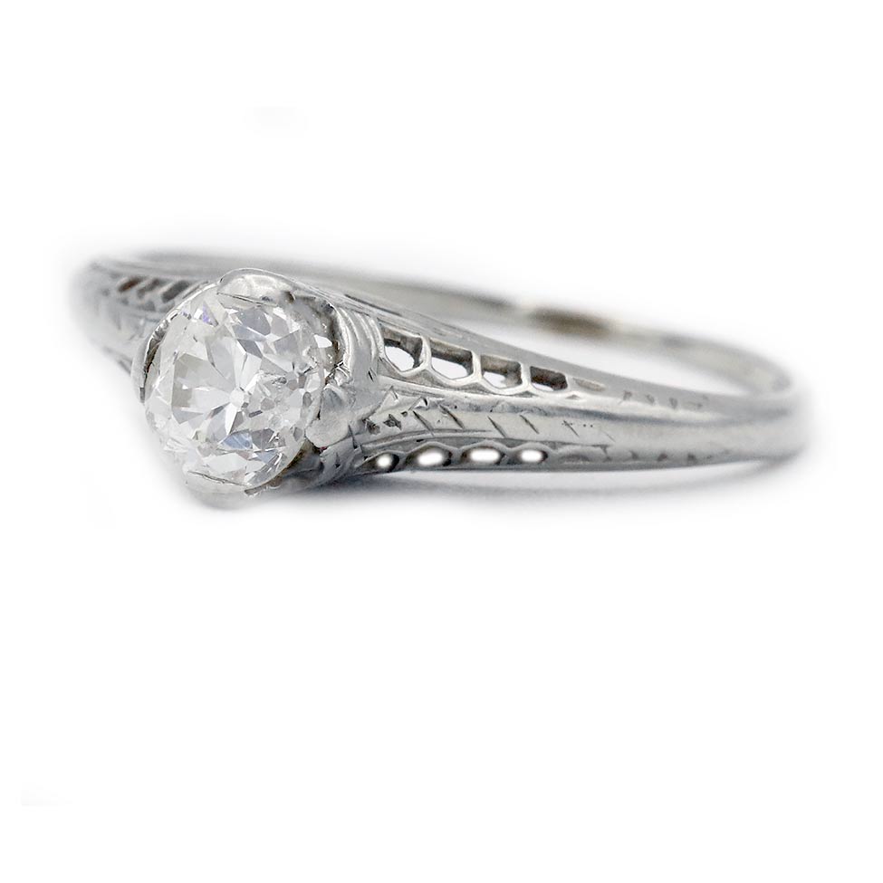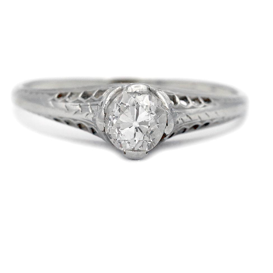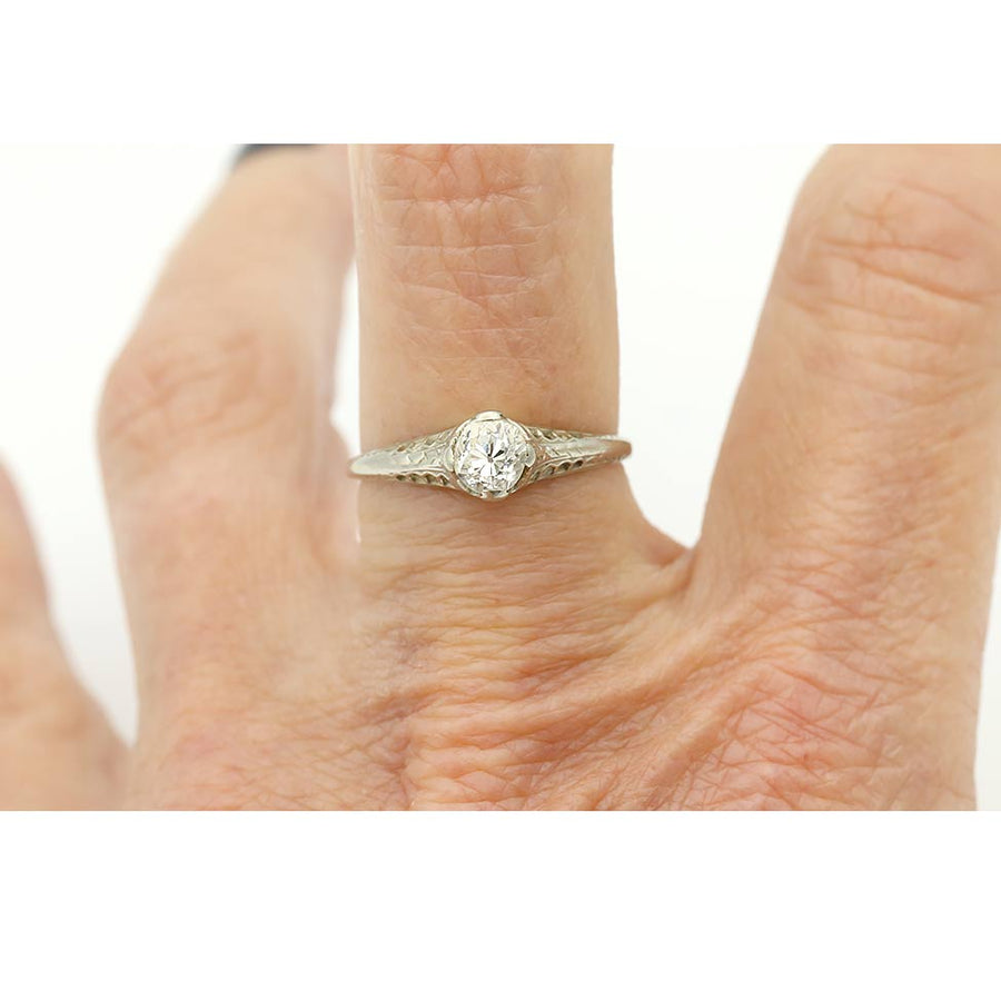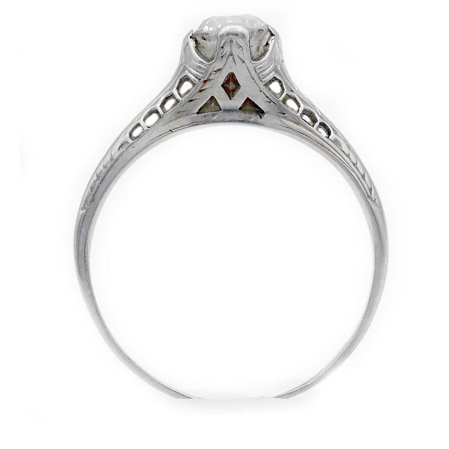 The Louise ring is an authentic Art Deco–era solitaire engagement ring dating to the 1920s. It features an AGI-certified old mine cut diamond weighing .40 carats, graded H color and SI2 clarity, set to stand tall within a classic 14K white gold setting. The ring is finished with refined open metalwork and delicate filigree engravings that reflect the craftsmanship of the Art Deco period. A timeless and elegant vintage solitaire, offered in good vintage condition with a touch of light patina.