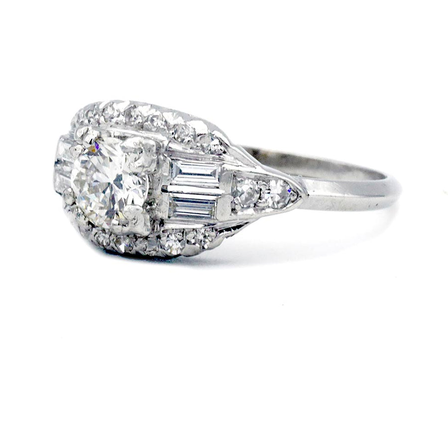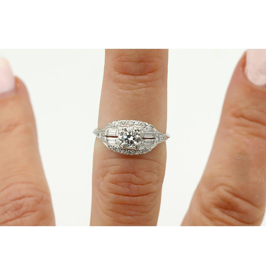 The Hillers ring is an original Art Deco engagement ring circa 1940s. This ring features a .44 carat GIA certified I color and VS1 clarity transitional cut diamond residing within trefoil prongs, flanked by four (4) straight baguette cut diamonds and surrounded by eighteen (18) single cut diamond accents. Beautifully crafted in platinum, this ring is classic and elegant.