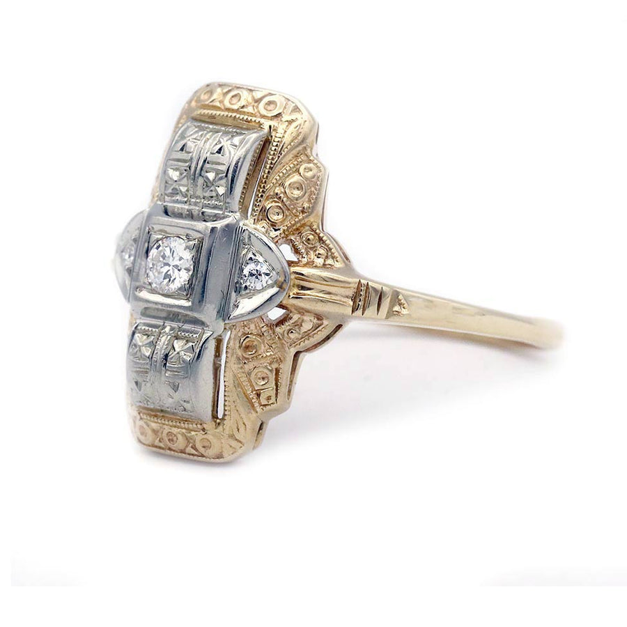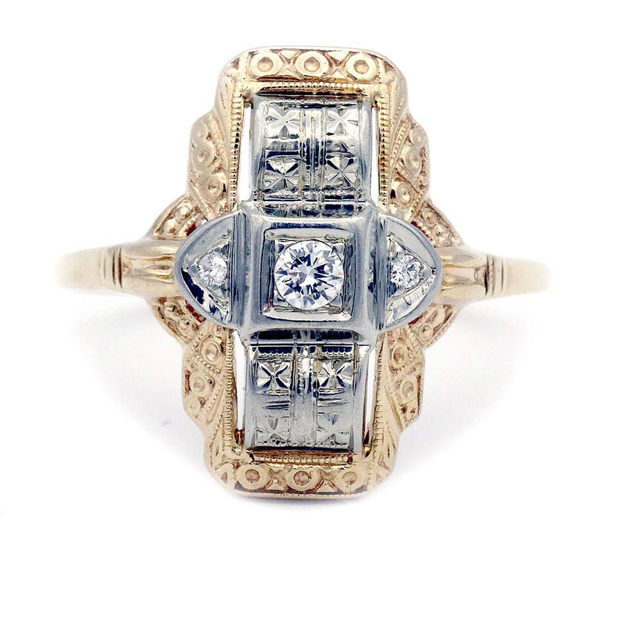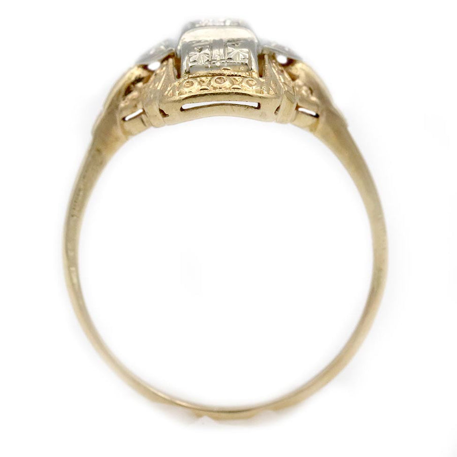 The Jabel ring is an authentic vintage diamond cocktail ring dating to the 1940s. It features a .10 carat transitional cut diamond graded E color and VS1 clarity, set within a crisp geometric square frame. The center stone is flanked by two old European cut diamond accents, adding balance and vintage character. Beautifully crafted in 14 karat white gold atop a gleaming 14 karat yellow gold band, the ring is finished with elegant swirls of metalwork and delicate milgrain engraving. A cool and distinctive vintage piece, preserved in very good vintage condition and signed and stamped Jabel.