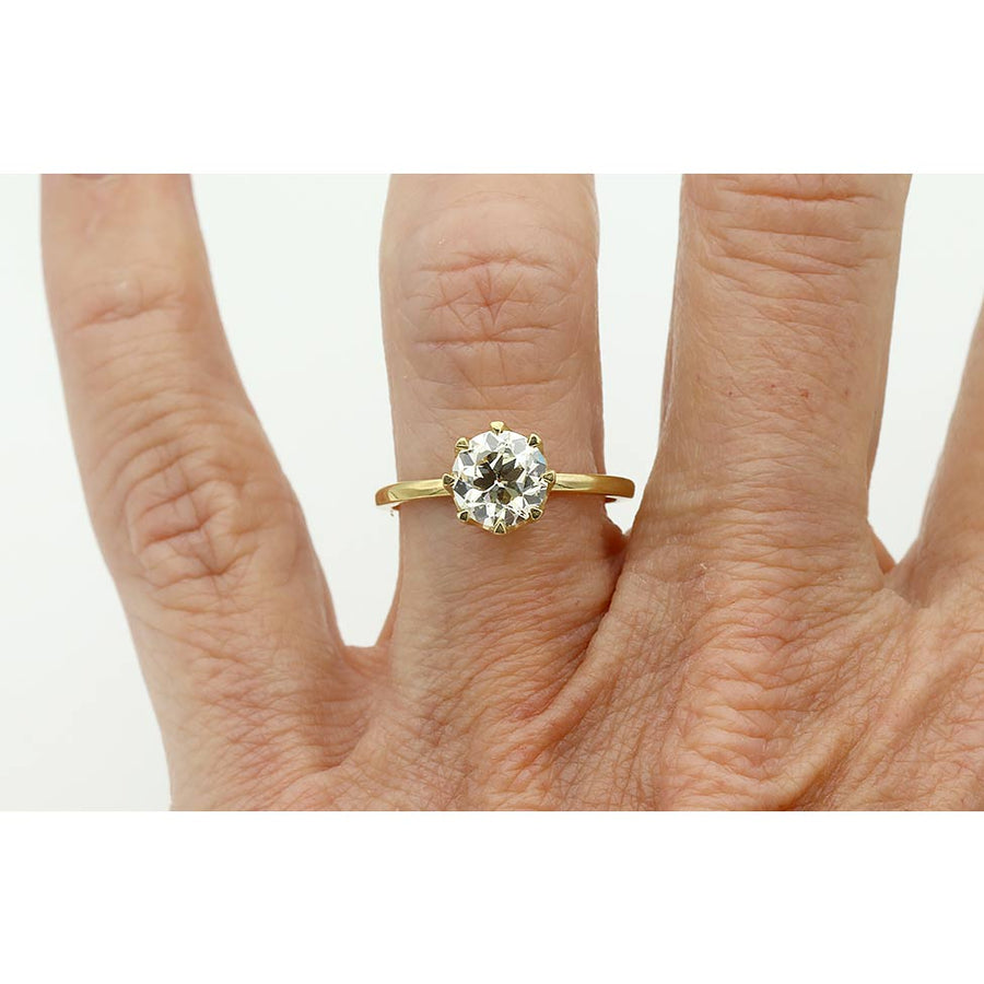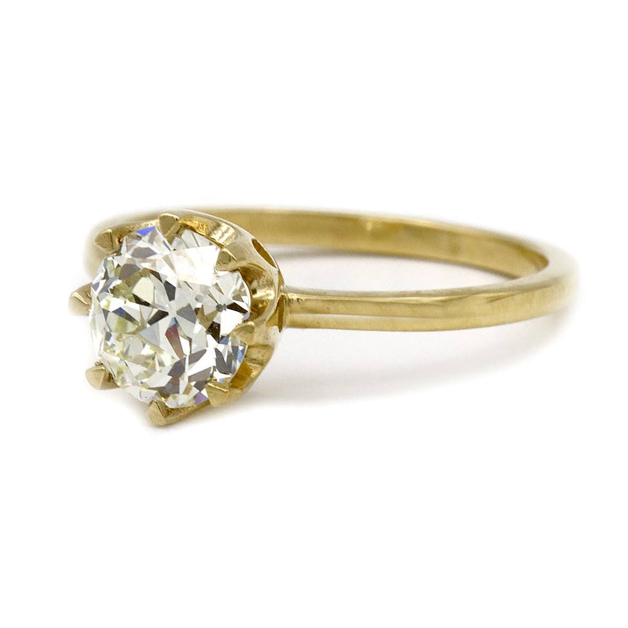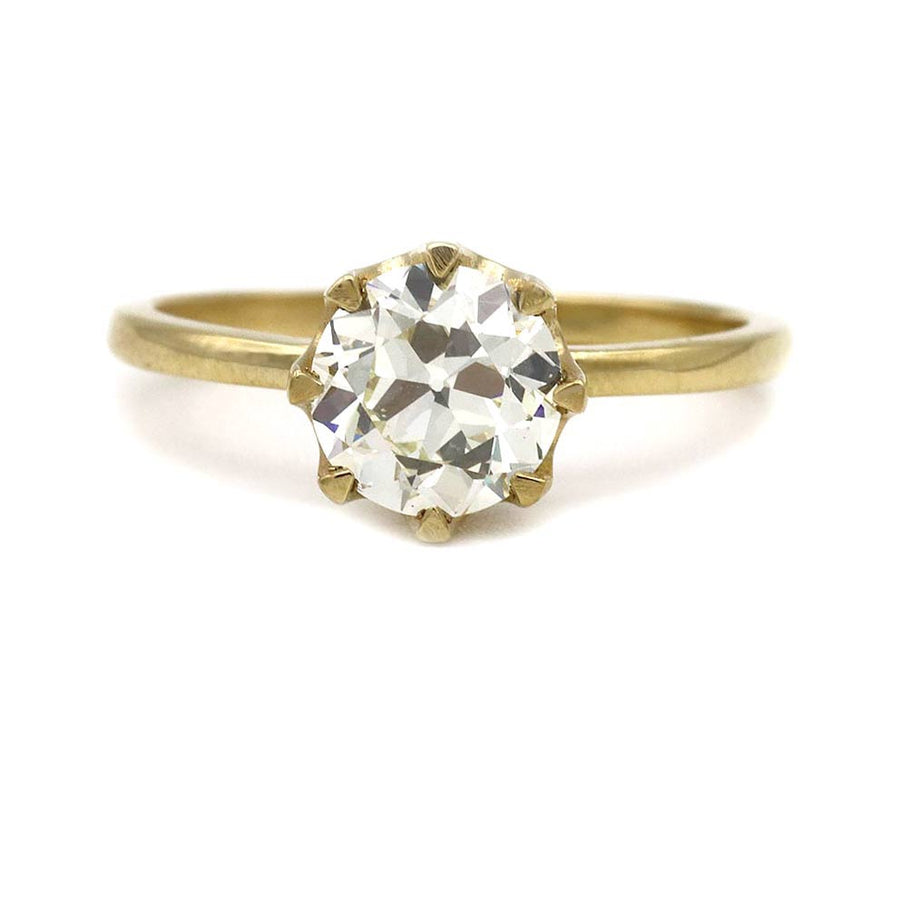 The Ambroise ring is a vintage-style engagement ring centered with a 1.21 carat Old European cut diamond of M color and VS1 clarity. The diamond is set in 14 karat recycled yellow gold with elegant claw prongs that highlight its wide facets and open culet. With the soft warmth and character typical of early 1900s diamonds, this piece was modeled after an authentic antique solitaire ring we once owned, capturing the proportions and presence of a true period design.