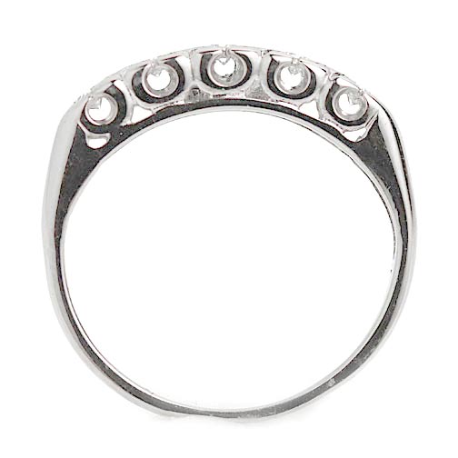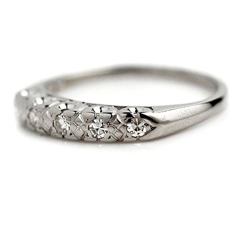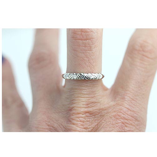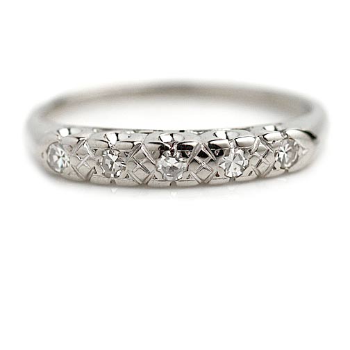 The Maria Prima band is an authentic antique wedding band from the Art Deco era circa 1940's. The band features 5 vintage single cut diamonds. Crafted in 14 karat white gold, accentuated with delicate filigree engravings. A sweet, timeless band that will perfectly complement your engagement ring or stack with other bands. In excellent condition.