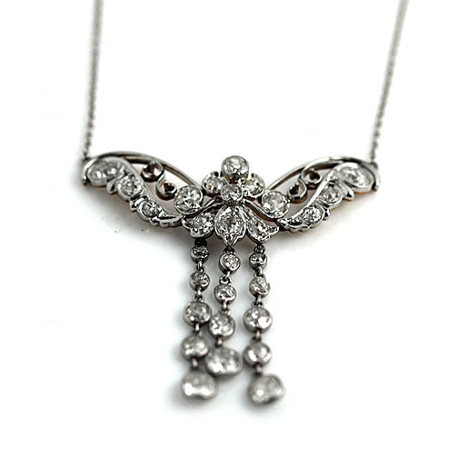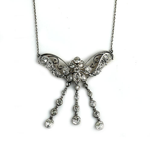 The Eve necklace is an authentic antique diamond necklace. This ravishing antique butterfly necklace dating back to the first decade of the last century, showcases 28 glittering old European cut diamonds weighing 5.00 carats (H color and VS2 clarity).  Magnificently hand crafted in platinum atop 18 kt yellow gold with 3 rows of dangling old European cut diamond drops. Stunning, sophisticated and timeless.  They don't come any finer. In pristine condition.
