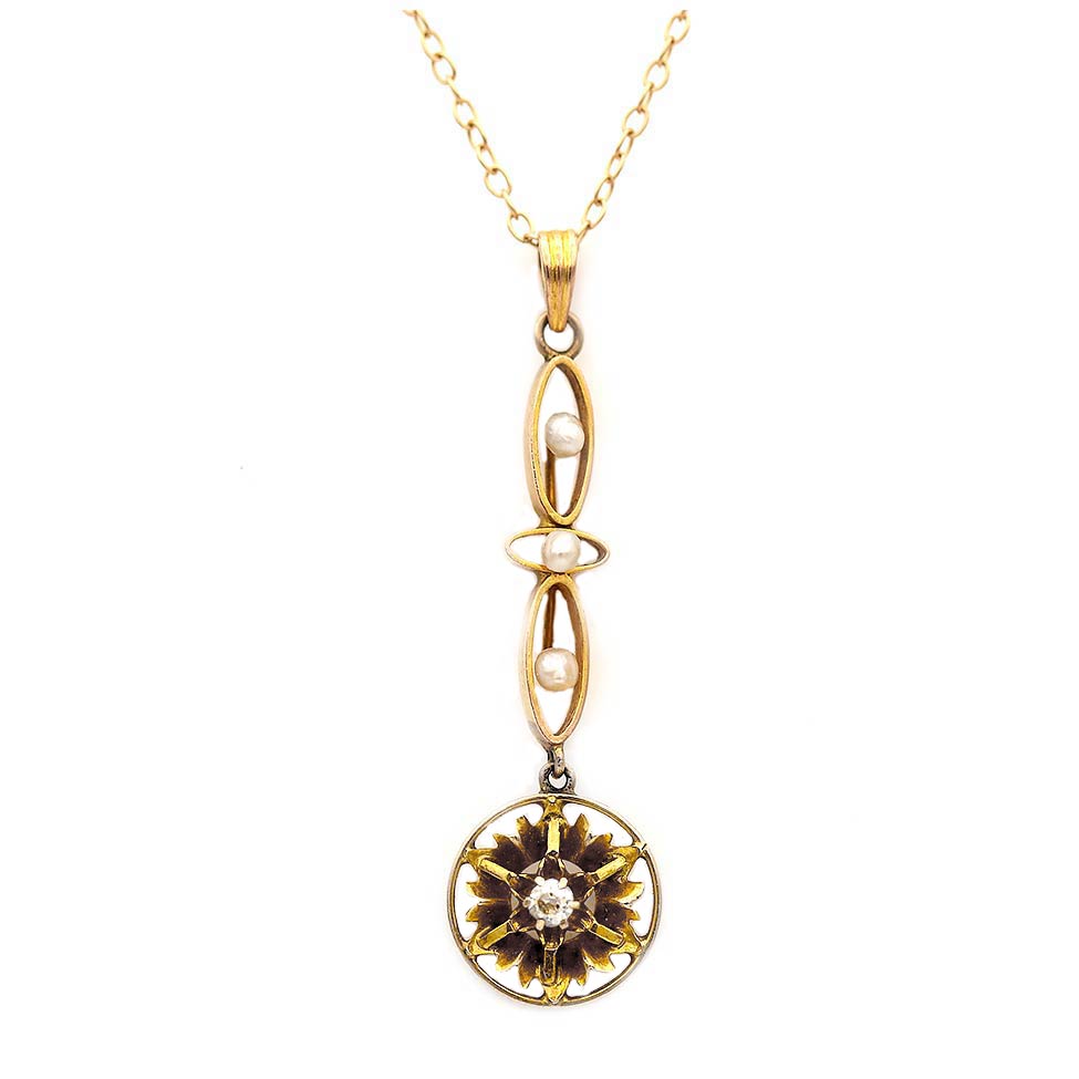 The Kennie necklace is an authentic Art Nouveau diamond circular starburst necklace circa 1900's. This lovely necklace features a .10 single cut diamond set within 6 knife edge prongs, atop a circular starburst frame with 3 seed pearls. Beautifully handcrafted in 10 kt yellow gold and accentuated with distinctive engravings. Chain measures 16 inches.