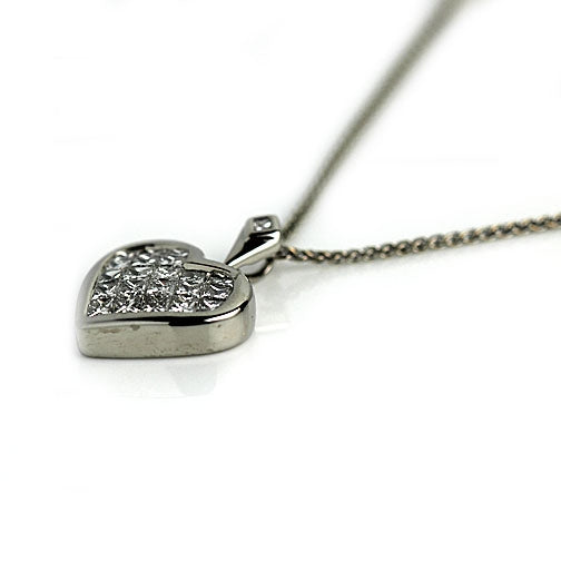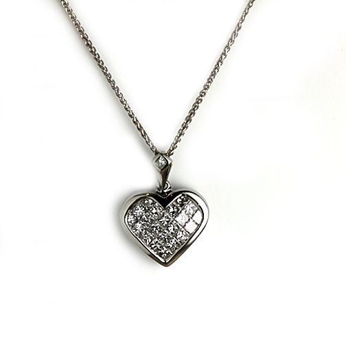 The Tamie pendant is an authentic vintage diamond heart pendant circa 1980's. The necklace showcases 21 glittering invisibly set princess cut diamonds weighing 1.75 carats of F color, VS2 clarity. Beautifully crafted in 18 kt white gold. In excellent condition. Your partners heart will always belong to you! Length is 16 ".