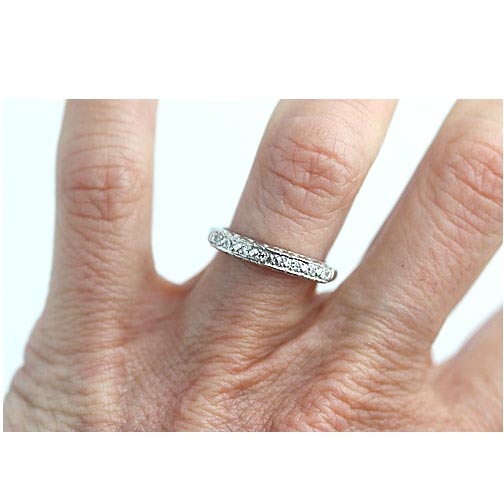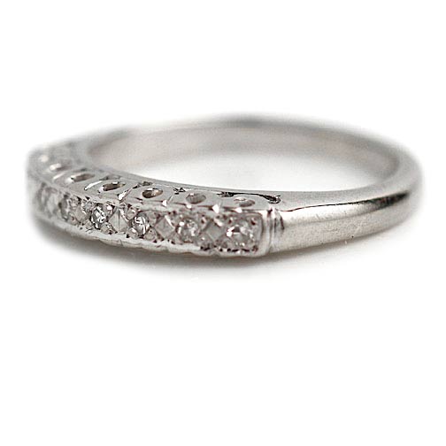 The Jillie J band is an authentic 8 stone vintage wedding band circa 1940's. The ring features 8 single cut diamonds, weighing .10 carat of H color, VS clarity. Hand engraved in 14 karat white gold. The perfect complement for your engagement ring or to stack with other bands. In very good condition.