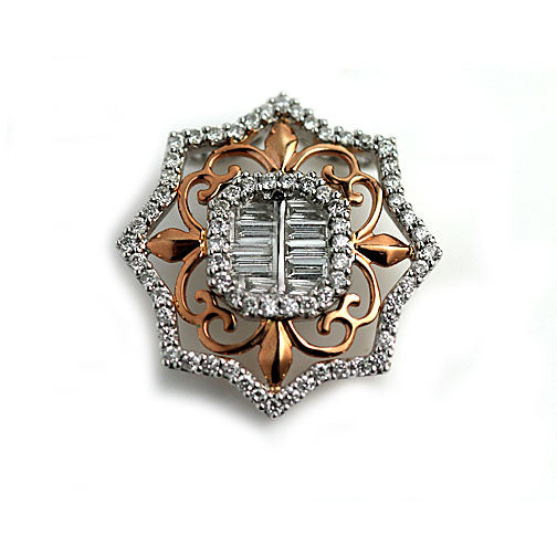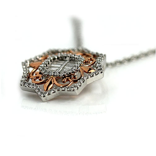 Tayla is a sweet vintage style necklace featuring 10 channel set straight baguette diamonds weighing .50 carat (F color and VS clarity), surrounded by 72 round cut diamond accents weighing .50 carat (F color and SI1 clarity).  Crafted in the 1980's in gleaming 18 kt white and rose gold.  A pretty necklace, in excellent condition. 16 " inches.  (AD1720)