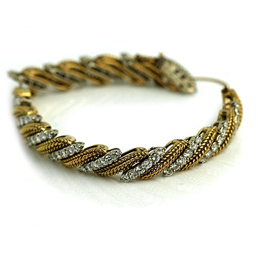 Luana is a magnificent estate diamond bracelet, composed of 78 bright-white round cut diamonds, weighing 11.00 carats (H color and VS2 clarity). This vintage  bracelet was beautifully handcrafted in the 1960's in gleaming 18 karat white gold alternating with 18 Kt yellow gold ribbed gold links. A superb bracelet, in excellent condition.  7 1/4 inches.
