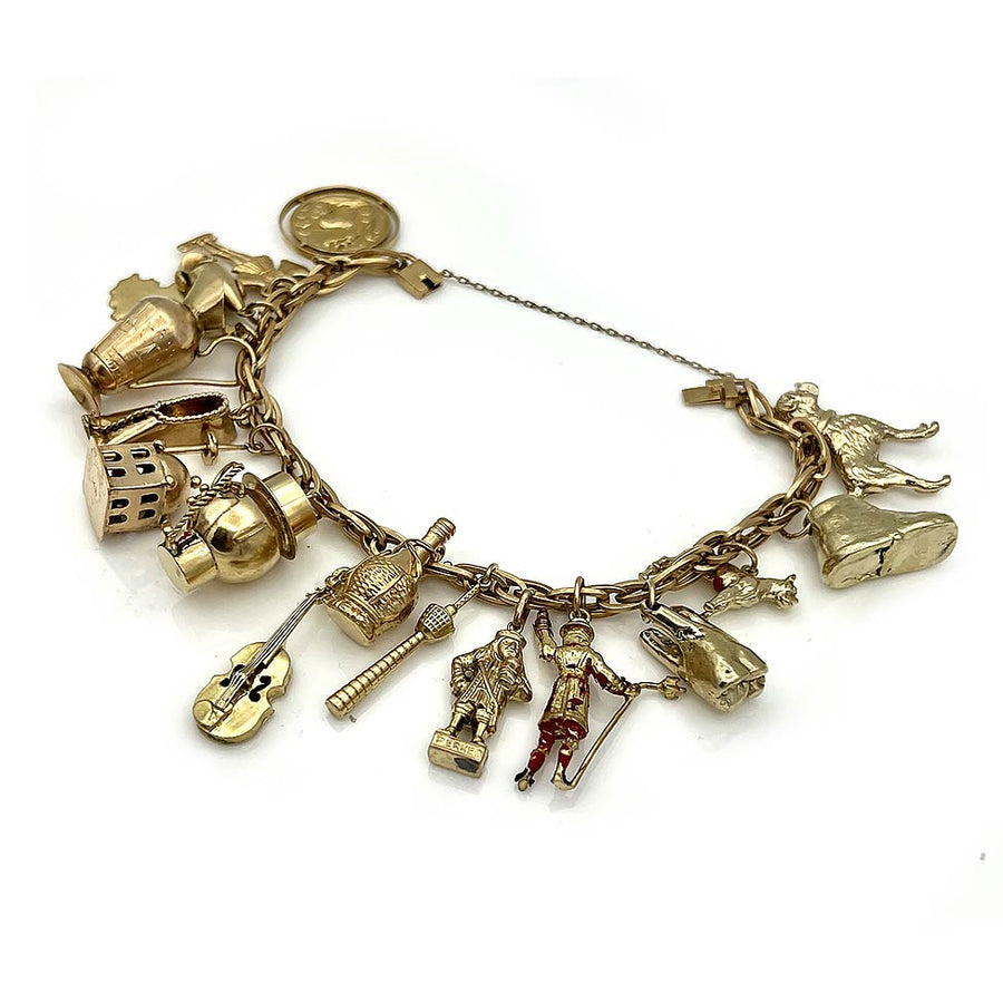 Take a journey through the past with this timeless and authentic vintage 1940's 14 kt yellow gold charm bracelet. Enjoy traveling back with a beautiful dog, a shoe, violin, wine jug, British royal guard, and race car among many others. 50.3 dwts. 7 inches in length.