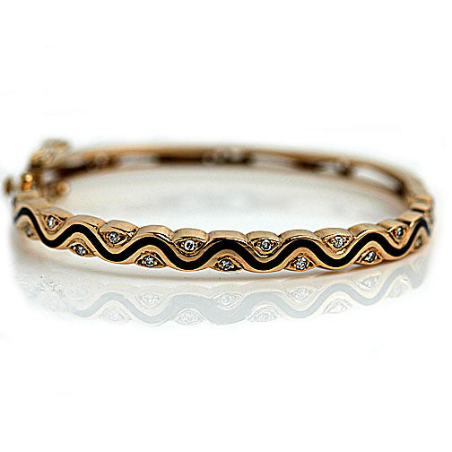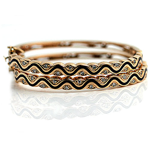 Two sleek and chic bangle bracelets, crafted in rich 14 karat yellow gold with gleaming Lapis are displayed throughout the center of this vintage bracelet, accompanied with glittering diamonds on each side all in a wavy fashion. Crafted in the 1970's in 14 Kt yellow gold. Wear the bracelets stacked day or night, together or by itself ! Measures 7 1/2 inches long by about 3/16 inch wide. 17.3 dwts. ( $1,750.00 each)