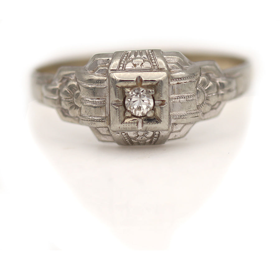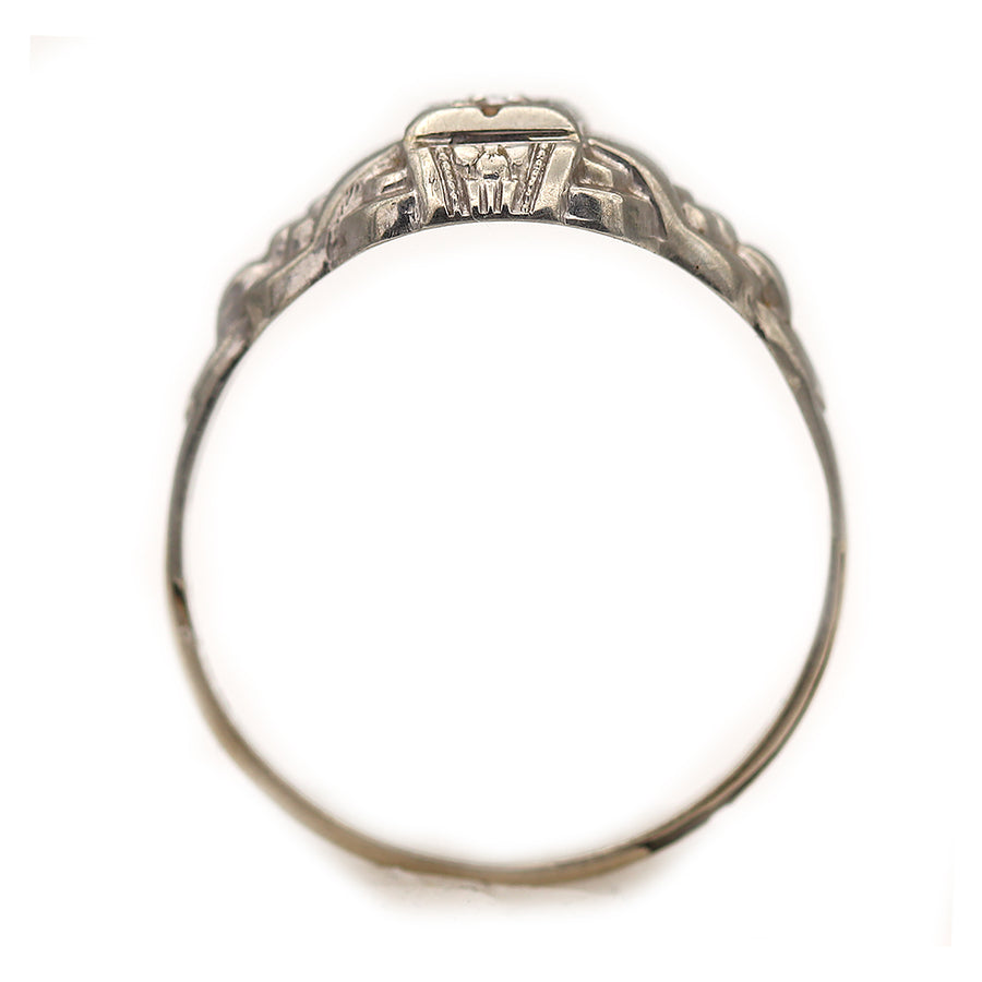 The Sinata ring is an authentic vintage engagement ring circa 1930s, featuring a .08 carat old mine cut diamond, residing in a geometric square migraine frame. Beautifully crafted in 14 kt white gold, and accentuated with delicate milgrain and filigree engravings, this is a very sweet ring in very good condition.