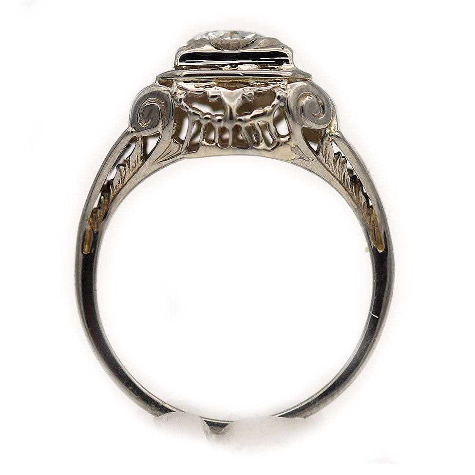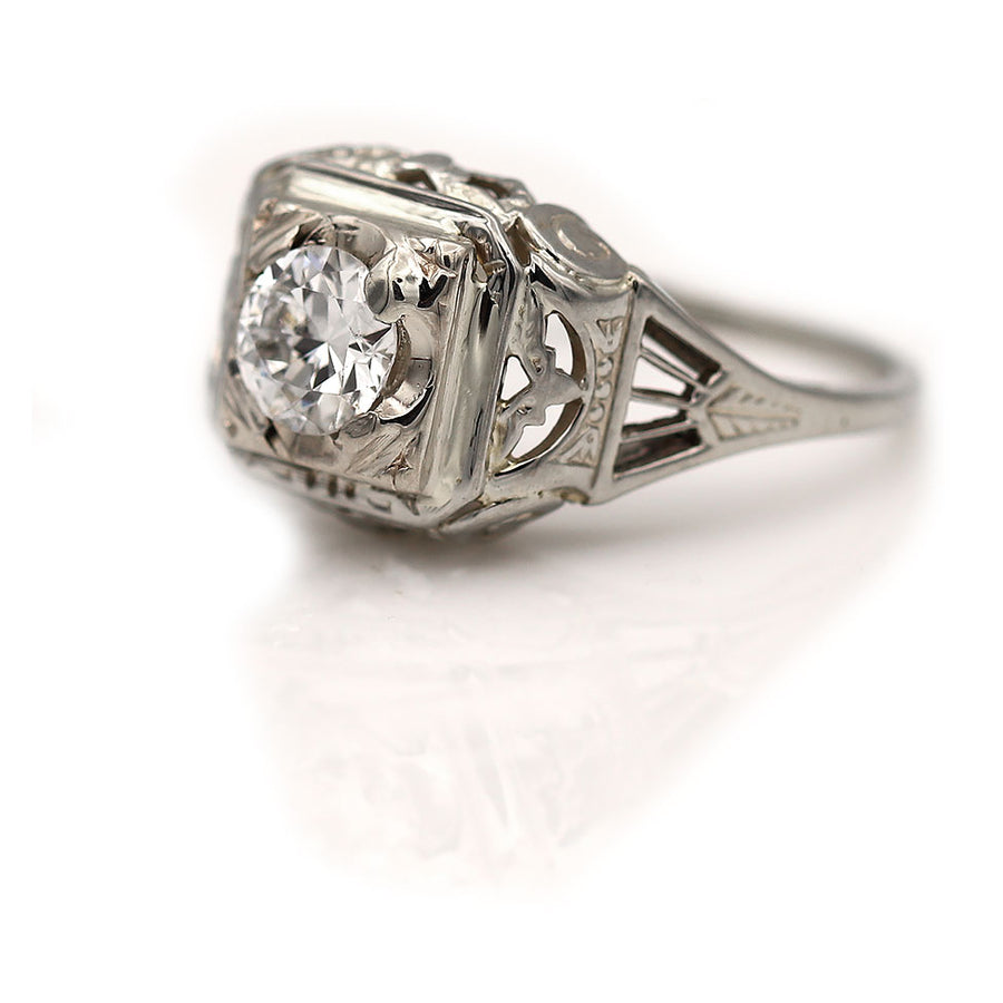The Stephiatta ring is an authentic antique diamond engagement ring circa 1920s. This ring features a .40 carat old European cut diamond with F color and VS2 clarity, residing in a two tiered geometric frame. Beautifully crafted in 18 kt white gold, and accentuated with open metal work and filigree engravings, this is a sweet antique piece, in very good condition.