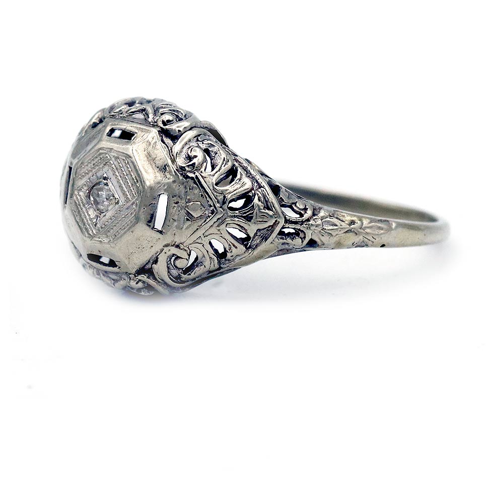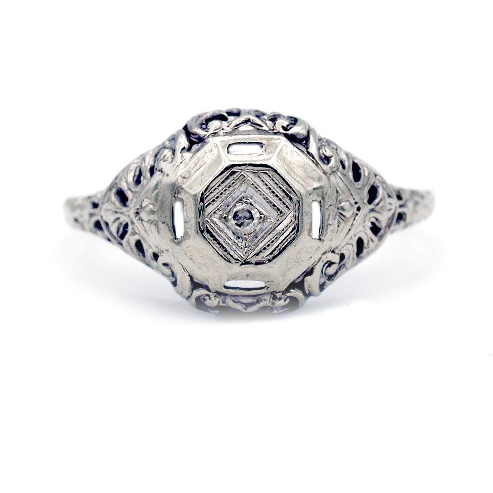 The Walfore ring is an authentic vintage engagement ring circa 1920s. The ring features a .03 carat single cut diamond residing within a geometric milgrain frame. Beautifully crafted in 14 kt white gold and accented with open metal work and filigree engravings.