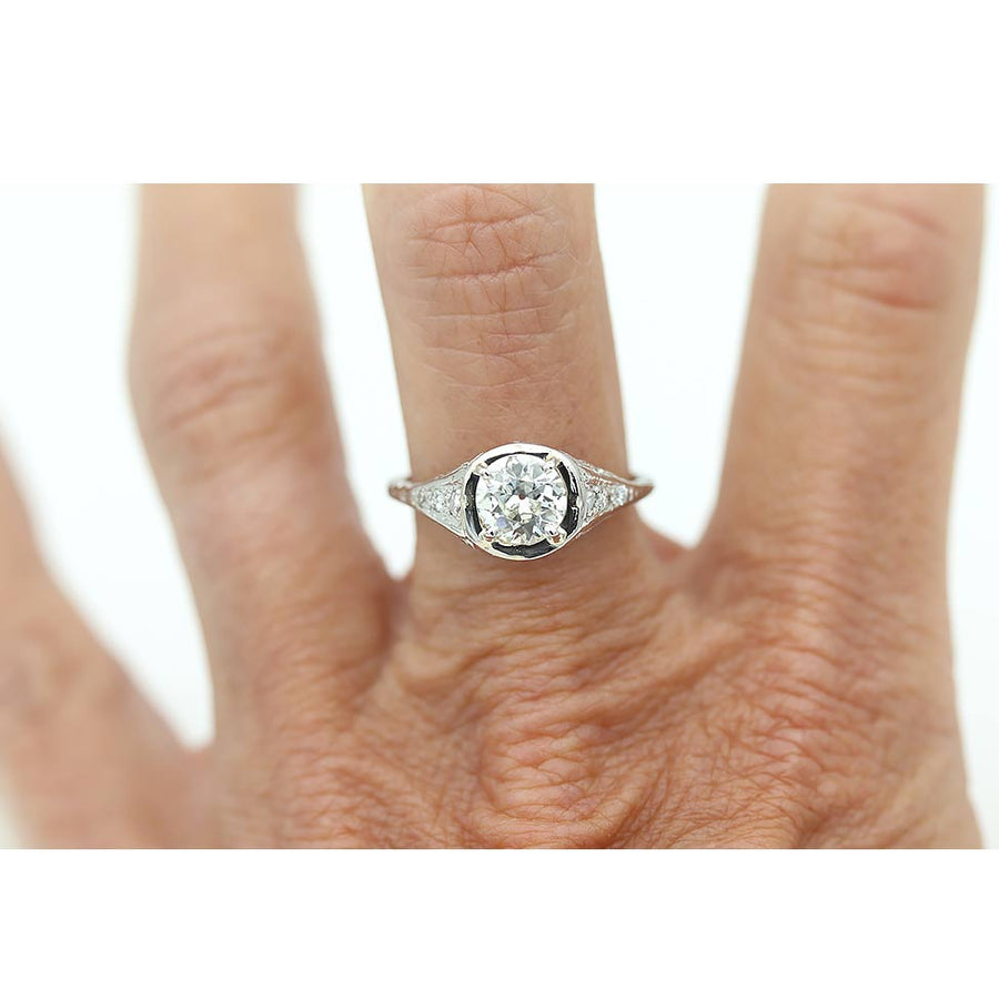 The Kaela ring, circa 1930s, is an authentic vintage diamond engagement ring from the Art Deco era, circa 1930's. centered with one (1) old mine cut diamond (weighing 1.02 carat with a GIA report stating K color and SI2 clarity), flanked by six (6) bead single cut diamond accents. Crafted in platinum, accentuated with open metal work and delicate filigree engravings. Measuring 8.6 mm at the top, to 6.2 mm, and tapering to 3.2 mm wide and 1.1 mm thick at the base of the shank. A sweet Art Deco piece in very good condition.
