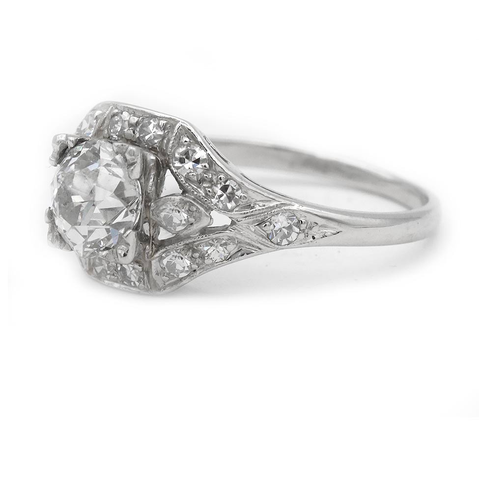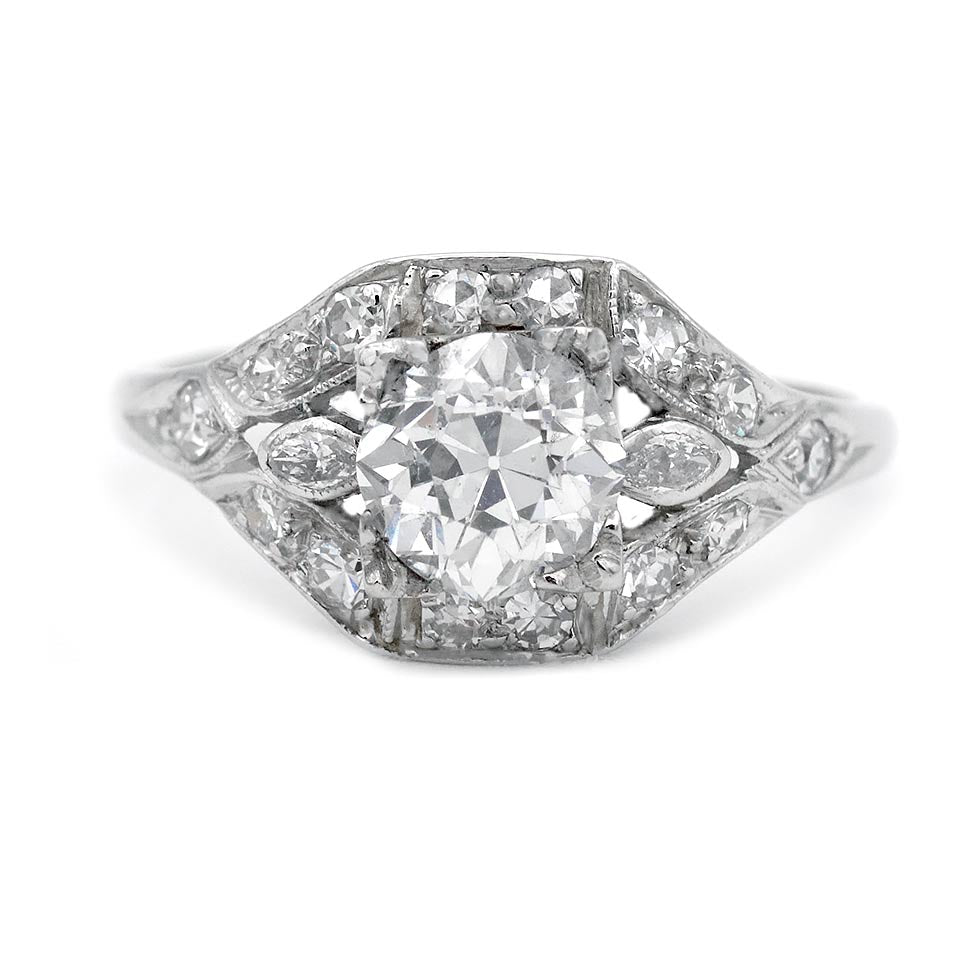 The Bergandi ring is an authentic Art Deco diamond engagement ring dating to the 1930s. At its center is a glittering GIA-certified .92 carat Old Mine cut diamond, graded I color and VS2 clarity, prong set for beautiful presence. The center stone is flanked by two navette-framed vintage marquise diamonds and further accented by fourteen single-cut diamond details. Beautifully crafted in platinum, the ring features a refined split shank and is finished with delicate milgrain engraving throughout. A timeless Art Deco jewel, offered in good vintage condition.