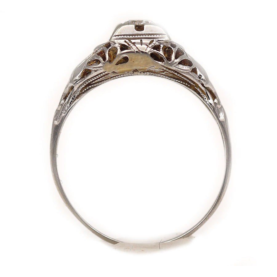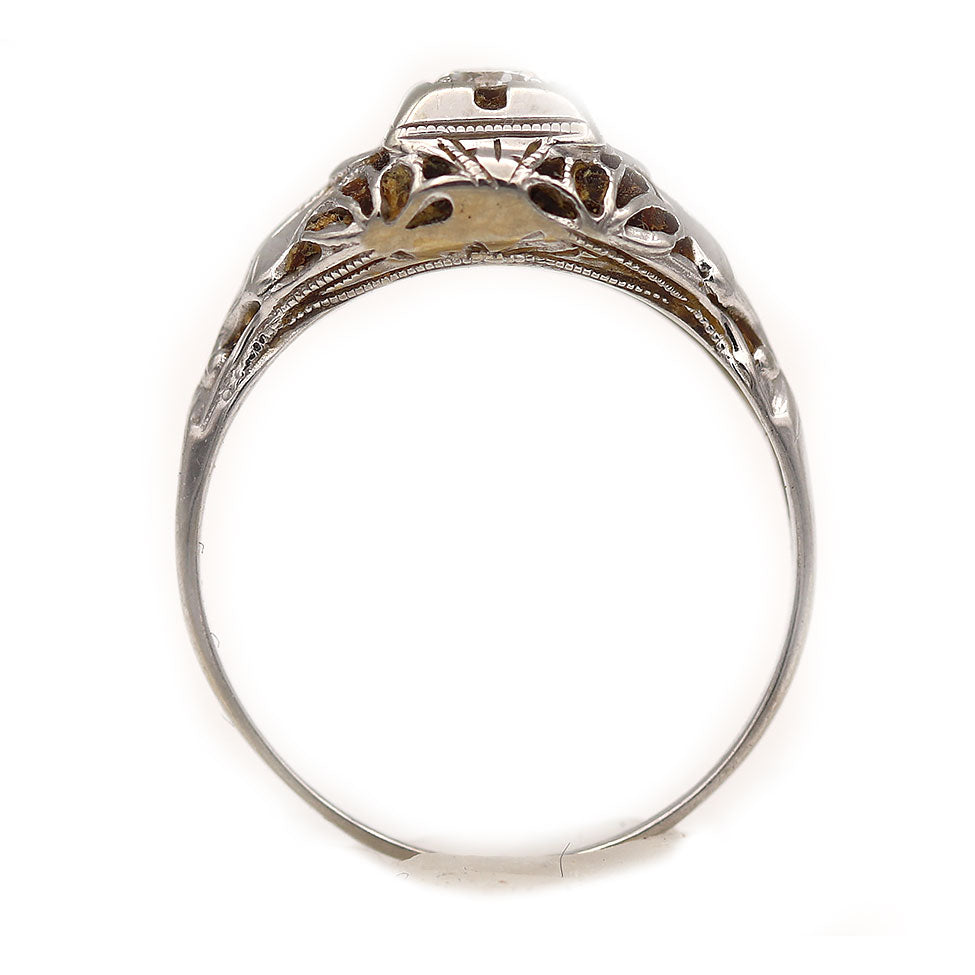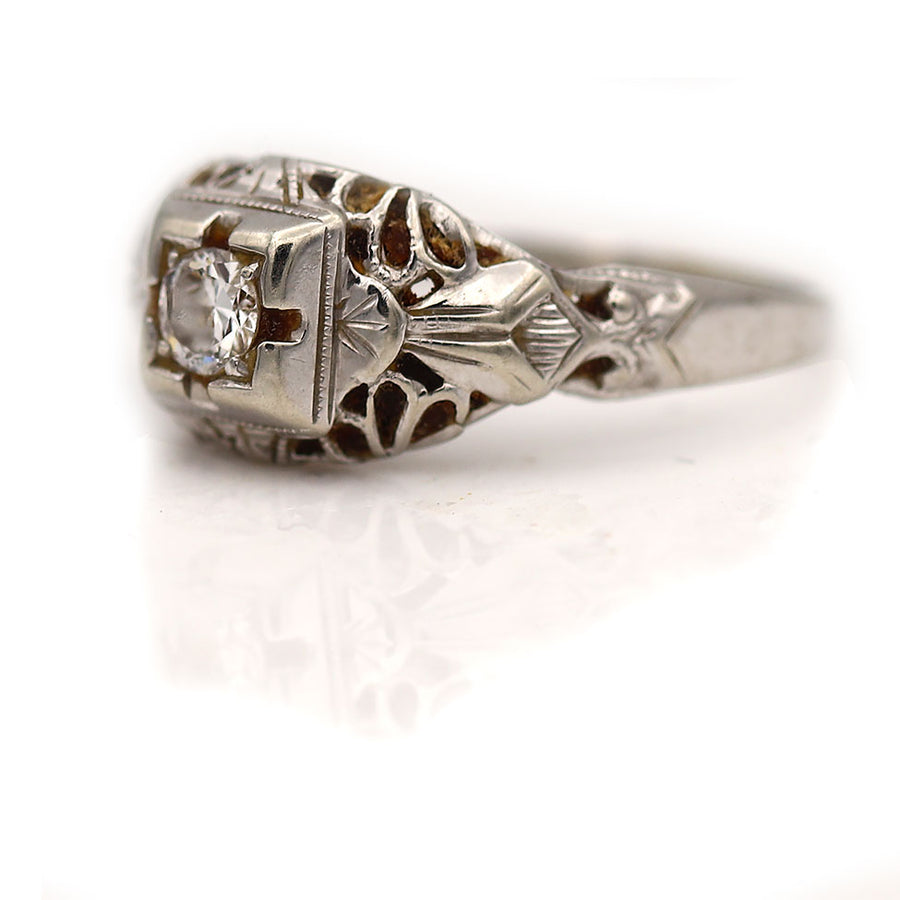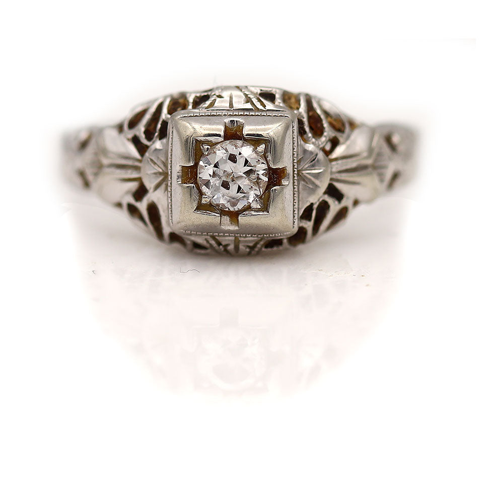 The September ring is an authentic vintage engagement ring from the Art Deco era, circa 1930s. This ring features a .20 carat old European cut diamond of G color and VS2 clarity, residing within a geometric square frame. Beautifully crafted in 18 kt white gold, accentuated with open metal work and delicate milgrain engravings. A classic Art Deco piece. In very good condition.