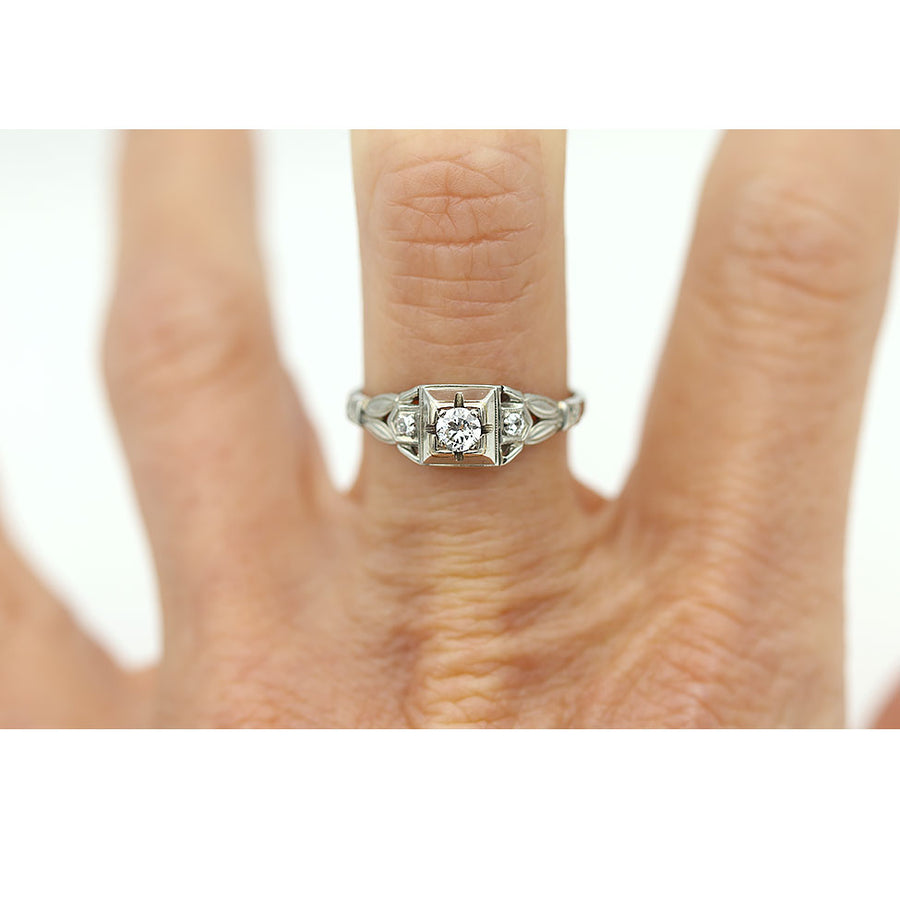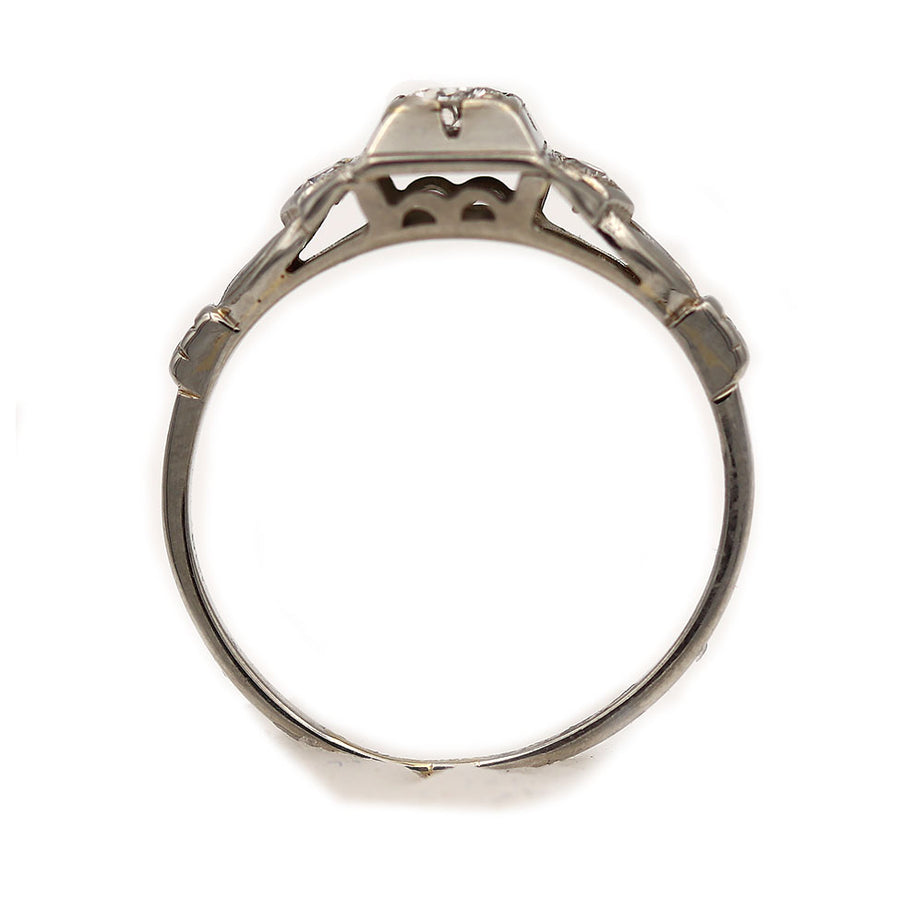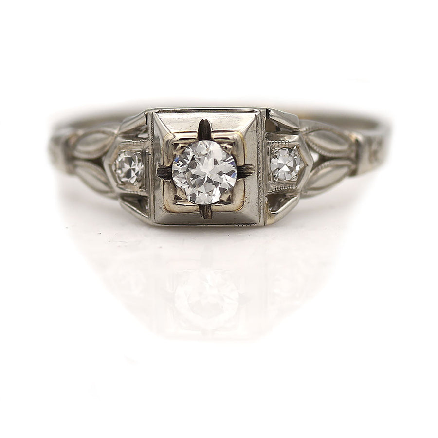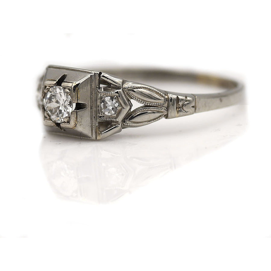 The Chelsea ring is an authentic vintage diamond ring from the Art Deco era, circa 1930s. This ring features a delicate .18 carat old European cut diamond of F color and VS2 clarity, residing in a geometric square frame, and flanked by two (2) single cut diamond accents. Crafted in the 1930's in gleaming 18 kt white gold, and accentuated with navette engravings. A sweet, timeless ring, in very good condition.
