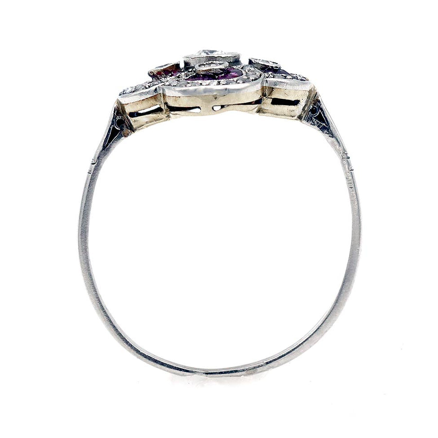 The Illyich ring is an authentic Art Deco ruby engagement ring circa 1920s. This ring features a bright-white .10 carat old mine cut diamond surrounded by a delicate halo of four (4) mine cut diamonds, 23 natural antique square Burma rubies and thirty six (36) rose cut diamond accents. Beautifully crafted in platinum. A beautiful Art Deco piece, and in good condition.