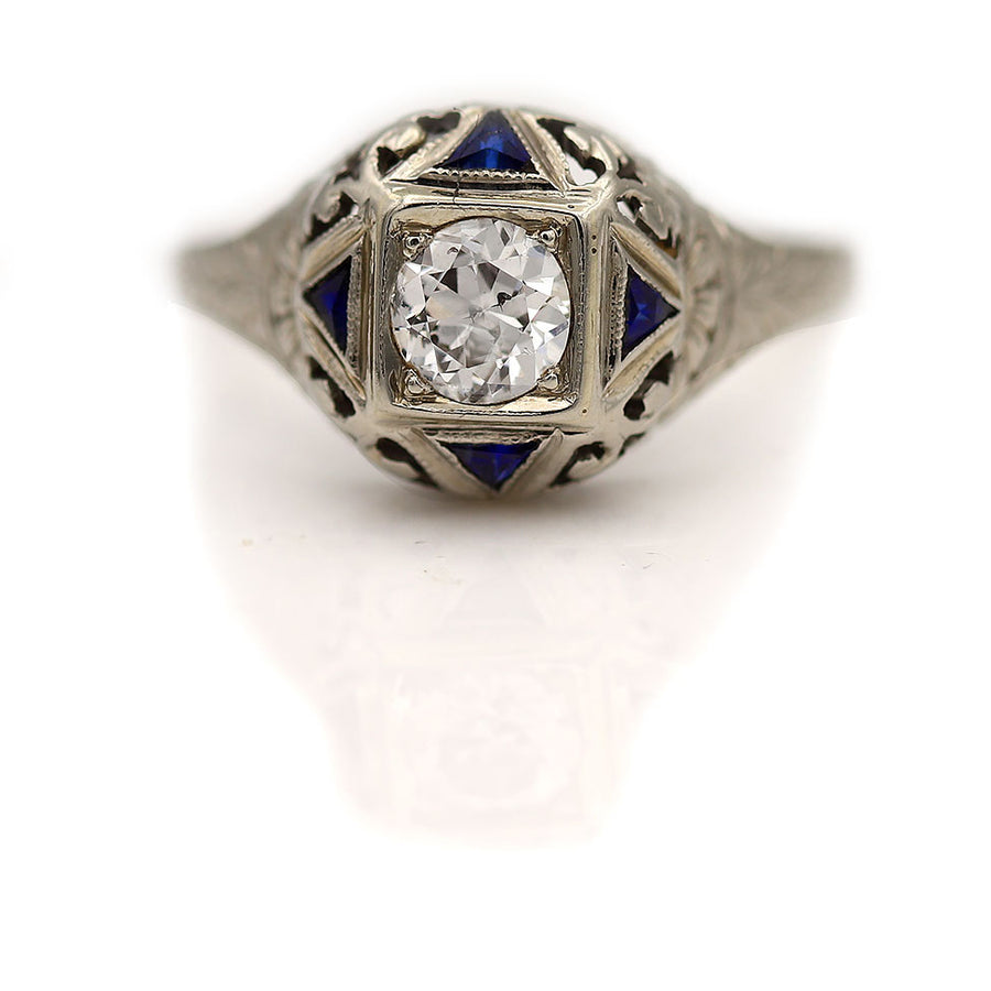 The Kaller ring is an authentic antique engagement ring, circa 1920's, featuring a .50 carat old European cut diamond with H color and SI2 clarity, residing in a geometric square frame surrounded by four (4) vintage synthetic triangle sapphires in a four point star. Beautifully crafted in 18 kt white gold, accentuated with delicate milgrain and filigree engravings. In very good condition.