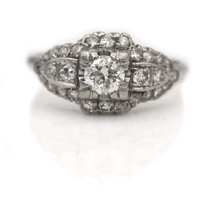The KC ring is an authentic vintage engagement ring, circa 1940's. This ring features a .35 carat old European cut diamond of H color and VS2 clarity residing within trefoil prongs, surrounded by twenty eight (28) old European and single cut diamond accents. Crafted in platinum, this is a lovely 1940's vintage ring in very good condition.