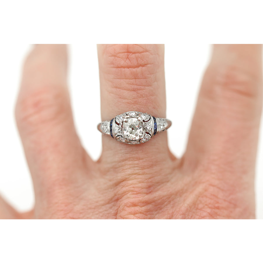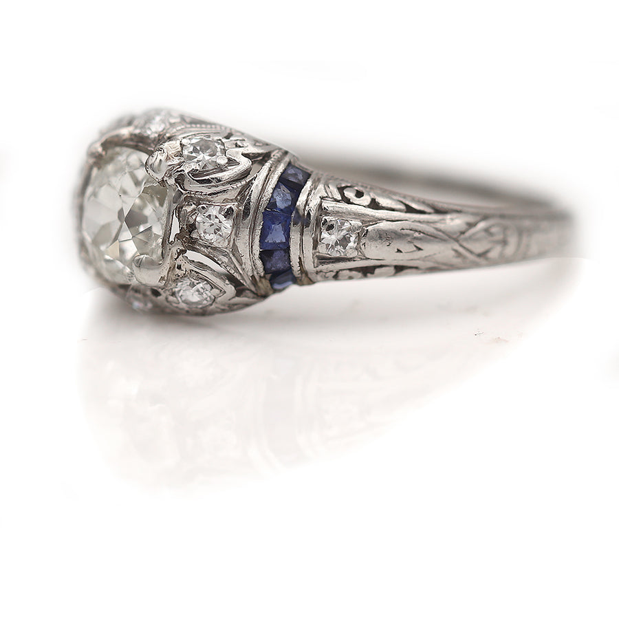 Vintage 1.10 CTW Old Mine Cut Diamond Platinum Sapphire Art Deco Engagement Ring