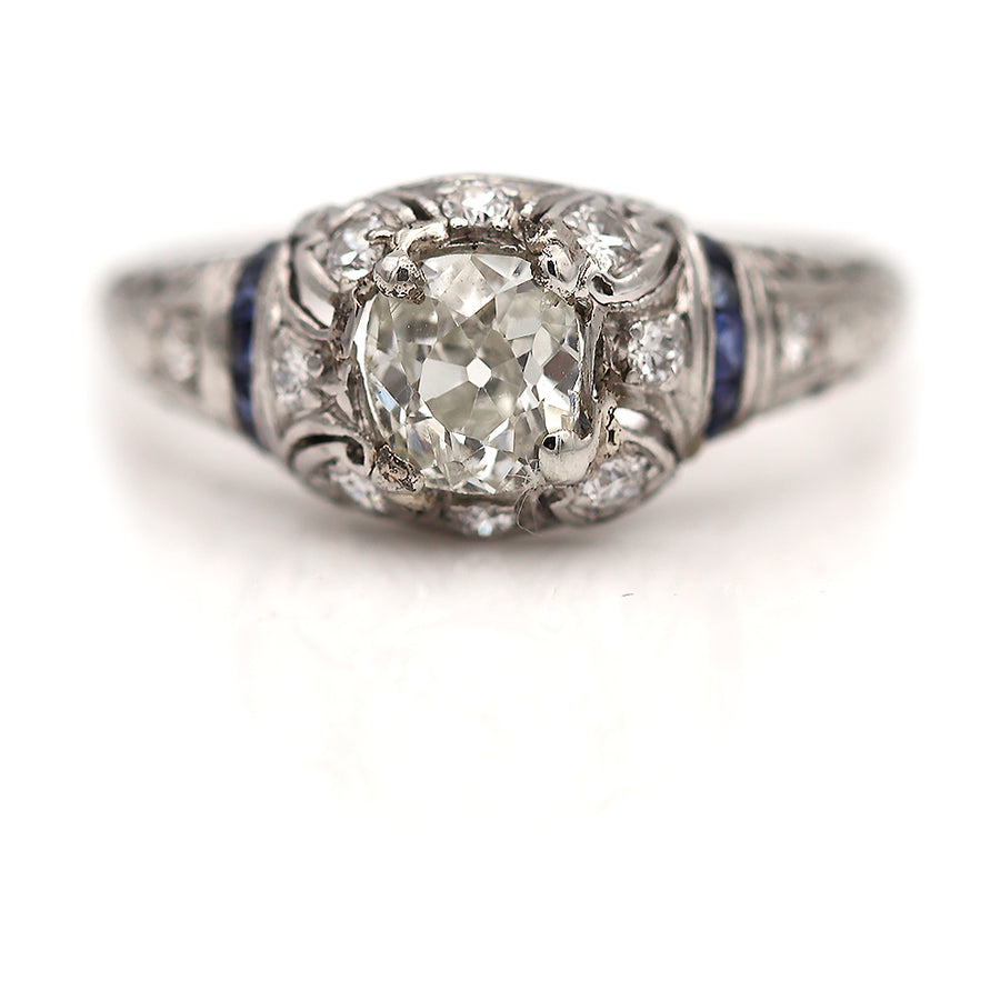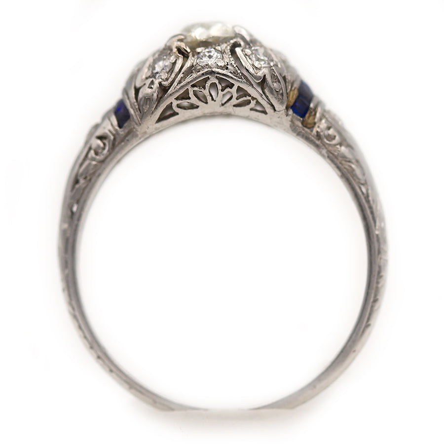 The Peterson ring is an authentic vintage engagement ring from the Art Deco era, circa 1930s. This elegant ring features a center old mine cut diamond (weighing .60 carat with L color and VS2 clarity), flanked by ten (10) synthetic square cut sapphires and ten (10) single cut diamond accents. Beautifully crafted in platinum, and accentuated with delicate open metal work. A sweet Art Deco beauty, in good condition.