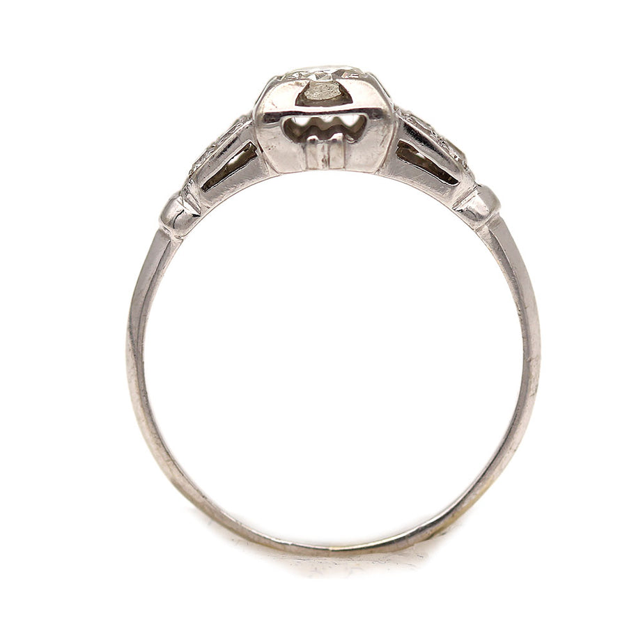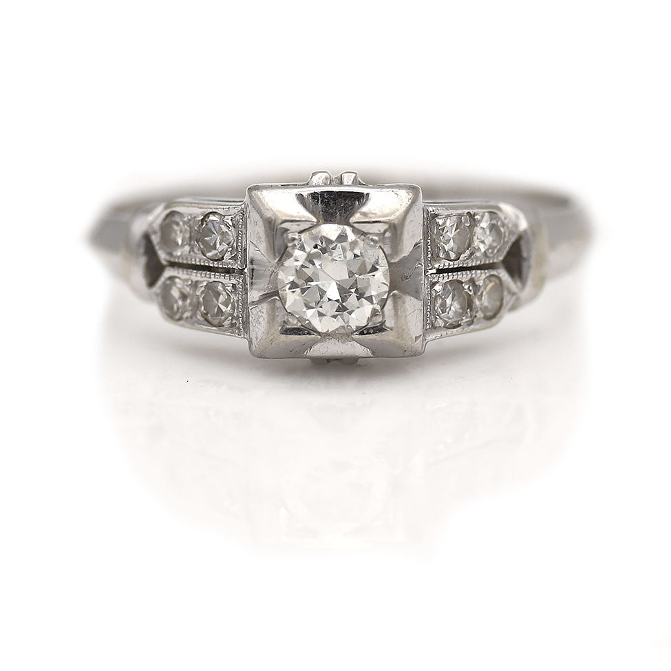 The Mahalia J ring is an original vintage engagement ring from the Art Deco era, circa 1930s. This ring features a bright-white .25 carat old European cut diamond of H color and VS2 clarity, flanked by a delicate 2 row split shank of eight (8) single cut diamond accents. Crafted in 18 kt white gold, accentuated with delicate milgrain engravings. A classic staple, in very good condition.