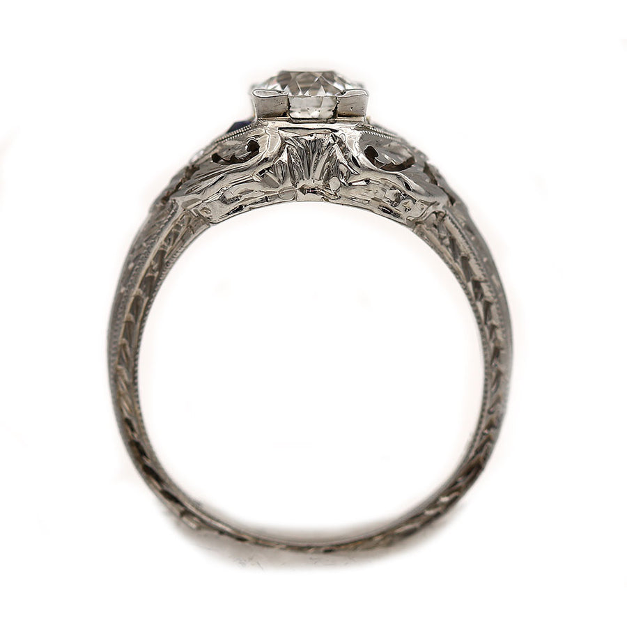 The Ferrie ring is an authentic vintage engagement ring from the Art Deco era, circa 1930's. This ring features a dazzling GIA .58 carat old European cut diamond of J color and VS2 clarity, flanked by two (2) synthetic sapphire triangles and two (2) single cut diamond accents. Superbly crafted in 18 karat white gold, and adorned with intricate filigree and milgrain engravings, this is a stunning vintage treasure. A very rare ring, in very good condition, and guaranteed to put a big smile on your face!