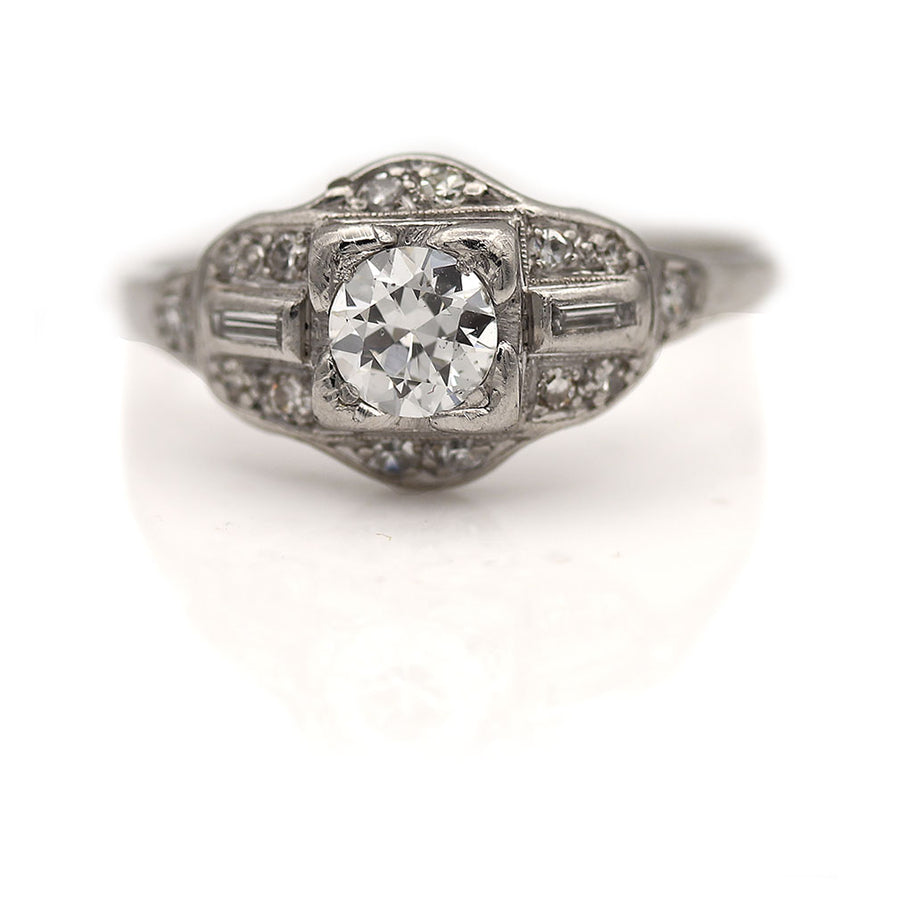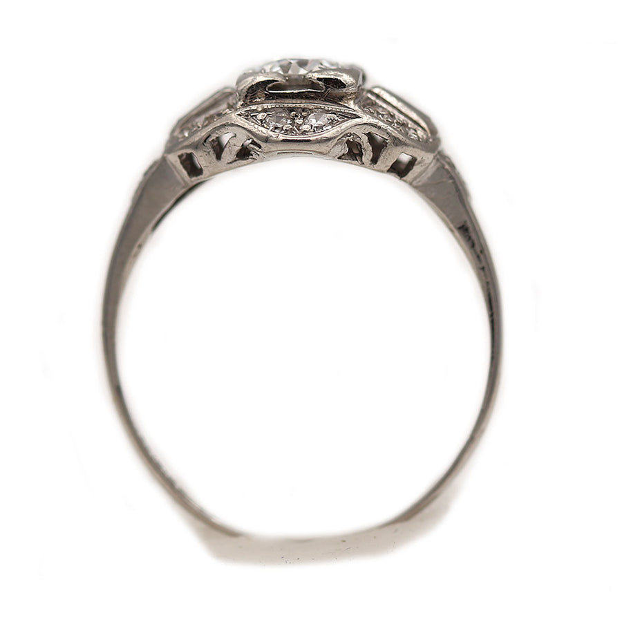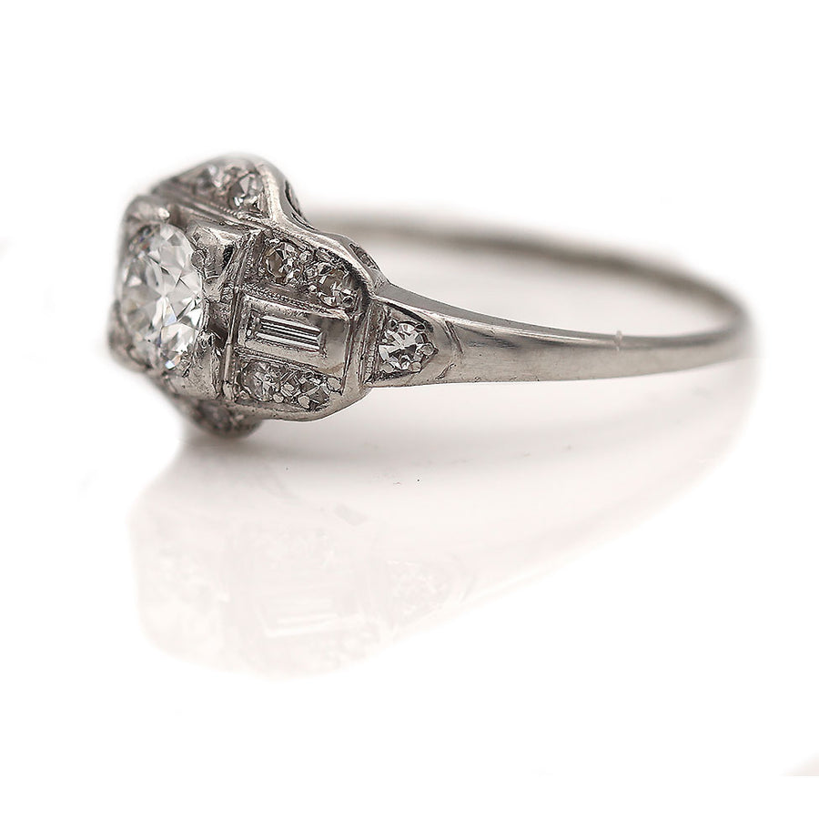 The Vaya ring is an authentic vintage engagement ring from the Art Deco era, circa 1940s. This ring features a bright-white .45 carat old European cut diamond with F color and VS2 clarity, residing in a geometric square frame. The diamond is flanked by two (2) straight baguette diamonds and surrounded by twelve (12) single cut diamond accents. Beautifully crafted in platinum and in very good condition. They don't come any lovelier!