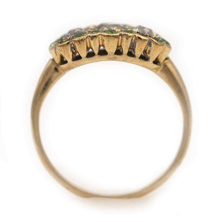 The Warrick ring is an authentic antique engagement ring, circa 1920's featuring a .25 carat natural center champagne old mine cut diamond flanked by two (2) old mine cut diamond accents, weighing .20 carat. The old mine cut diamonds are surrounded by a delicate cluster of eighteen (18) natural round cut demantoid garnets. Beautifully crafted in 14 kt yellow gold, this ring is stunning and very hard to find. In very good condition