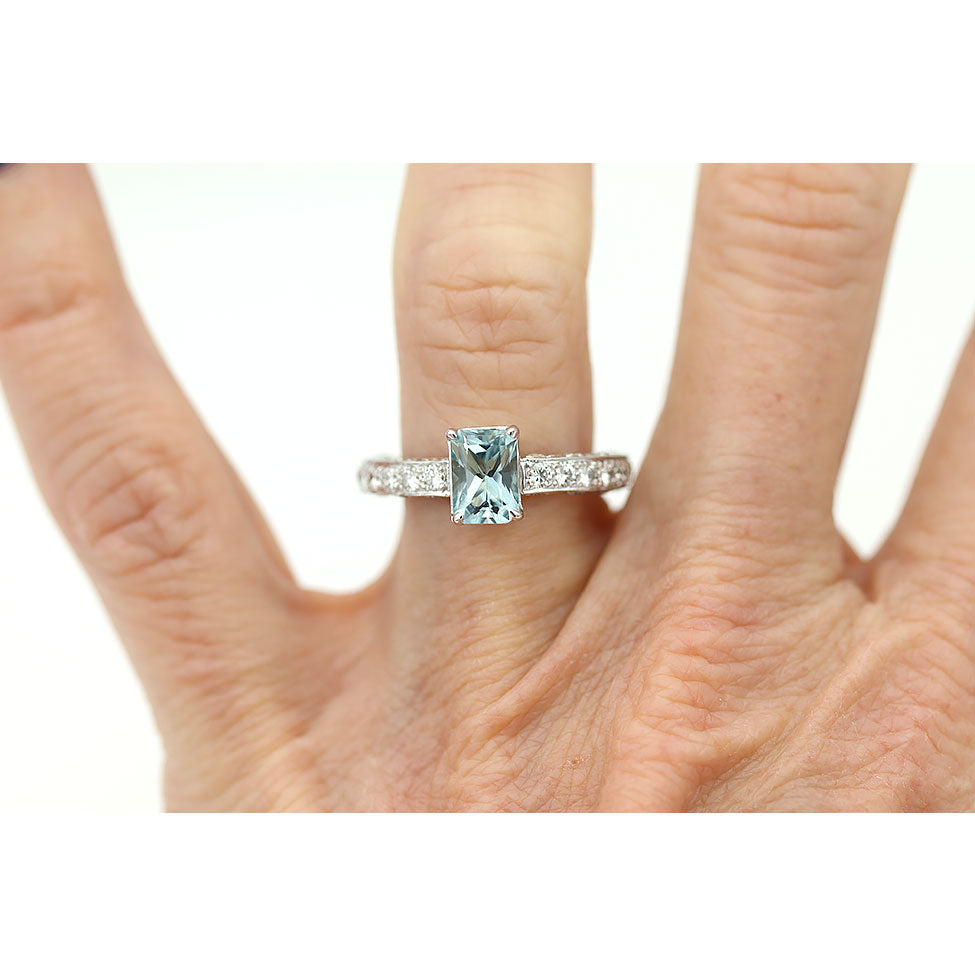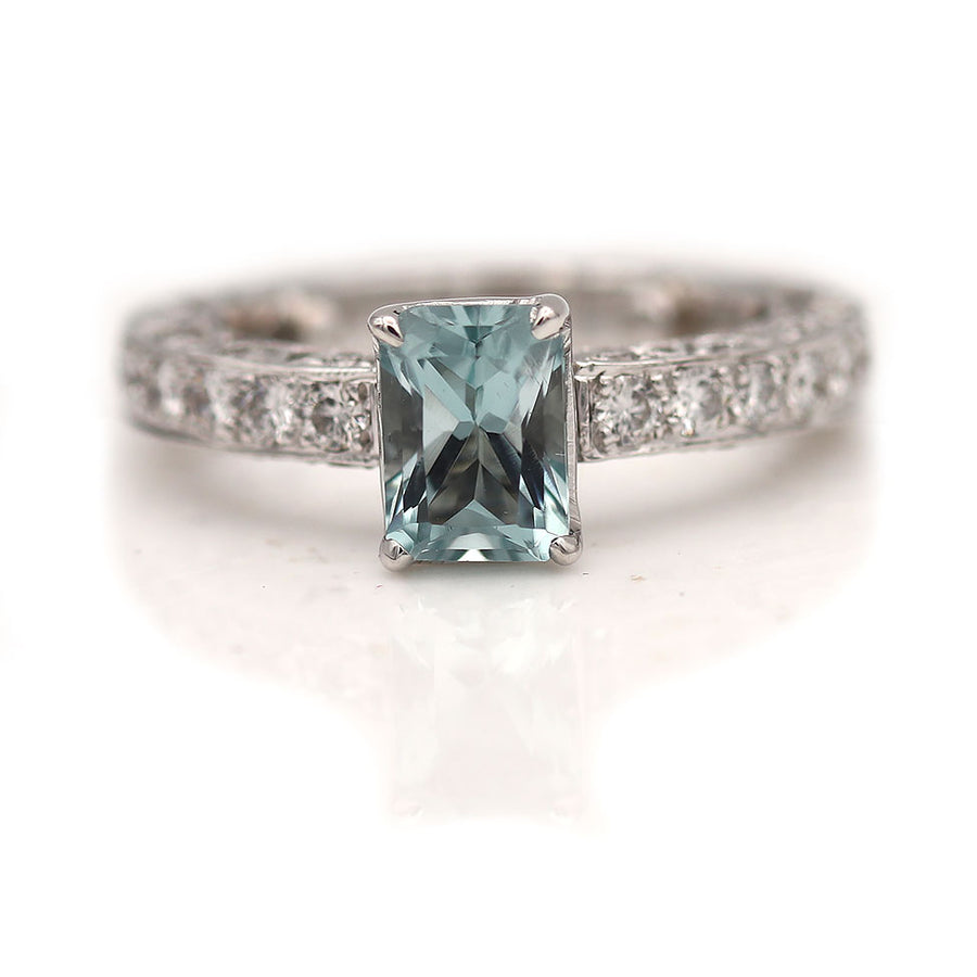 The Jarnely ring is an authentic vintage gemstone engagement ring, circa 1980's. This ring features a natural sky blue, .90 carat emerald cut aquamarine, flanked by thirty six (36) round cut diamond accents weighing approximately 1.20 carats. Beautifully crafted in 14 kt white gold, and accentuated with milgrain engravings, this ring is in very good condition.