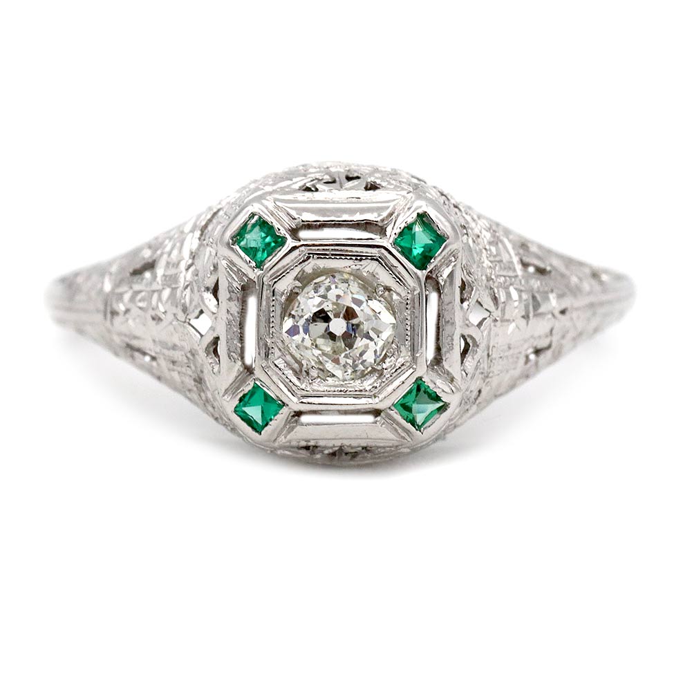 The Missi ring is an authentic antique engagement ring from the 1930s. At its center, a .20 carat Old Mine cut diamond is set within a crisp, octagonal milgrain frame that catches the light beautifully. The diamond is flanked by four vibrant, square-cut emeralds, creating the sharp green contrast that defined the Art Deco period. Crafted in 18 karat white gold, the setting is detailed with fine filigree and open metalwork. This original piece is a standout example of 1930s design, preserved in very good condition.