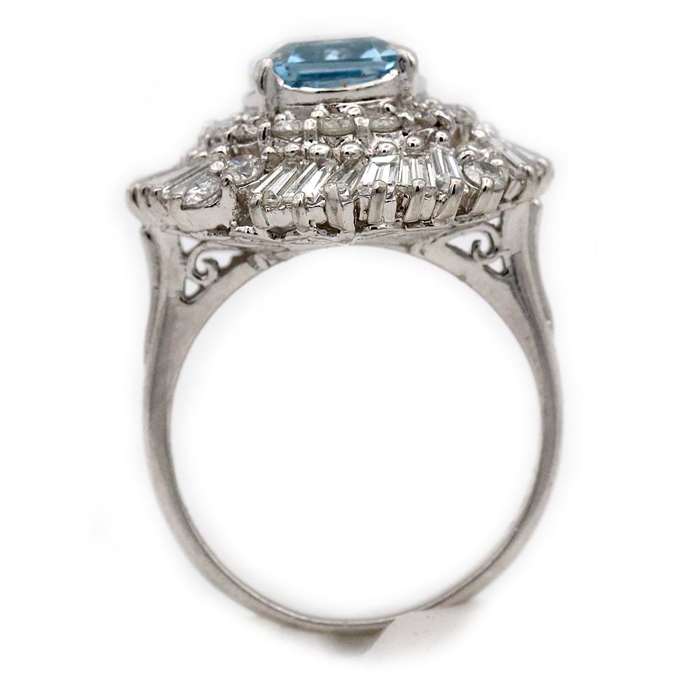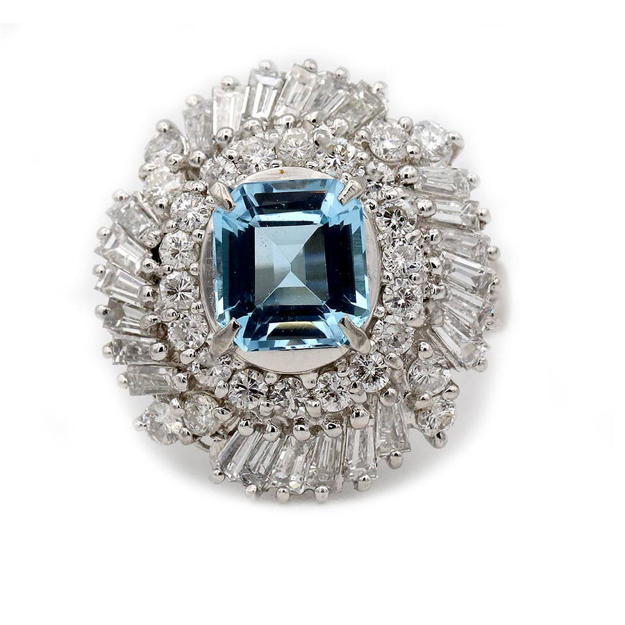 The Fischer ring is a stunning 1980s vintage aquamarine ballerina ring featuring a natural 2.10 carat vintage natural square cut aquamarine surrounded by fifty (50) baguette and round cut diamond accents, weighing approximately 2.20 carats. Beautifully crafted in platinum, this is a beautiful alternative ballerina ring that is in very good condition. Perfect to wear on either hand. The ring measures 19.7 mm at the top, tapering to 5.0 mm and 2.8 mm at the bottom.