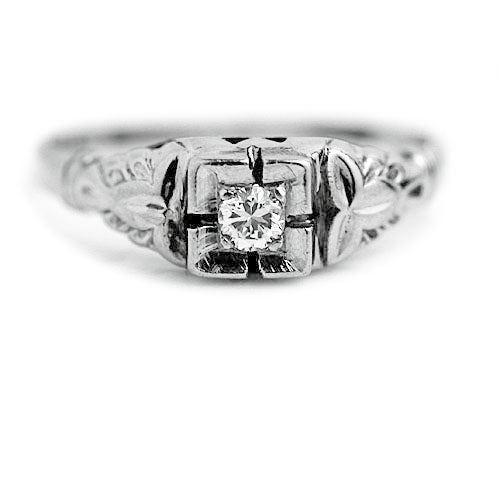 The Maren ring is an authentic vintage engagement ring from the Art Deco Era circa 1940’s. The ring features a .10 carat transitional cut diamond of F color, VS2 clarity, residing in a geometric square frame. The diamond is flanked by delicate floral engravings. Crafted in 14 karat white gold, beautifully accentuated with filigree engravings. A timeless vintage ring with beautiful engravings. In very good condition.