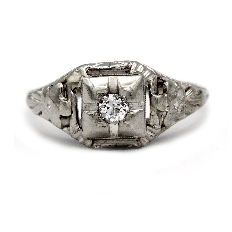 The Gladys ring is an authentic vintage engagement ring from the Art Deco era circa 1930s. The ring showcases a .15 carat old mine cut diamond of F color, VS2 clarity, residing in a geometric square milgrain frame. Crafted in 18 karat white gold, delicately completed with filigree engravings. An Art Deco delight, with delicate floral engravings. In good condition.