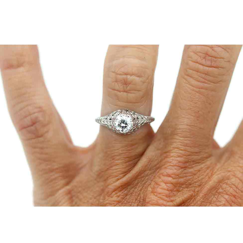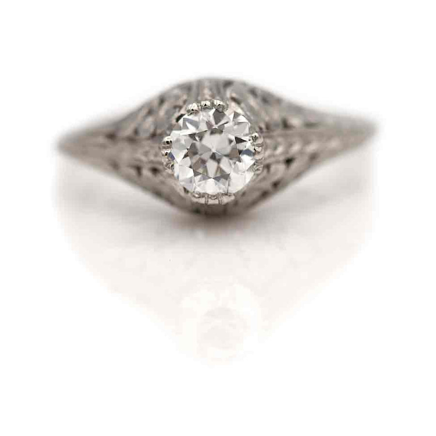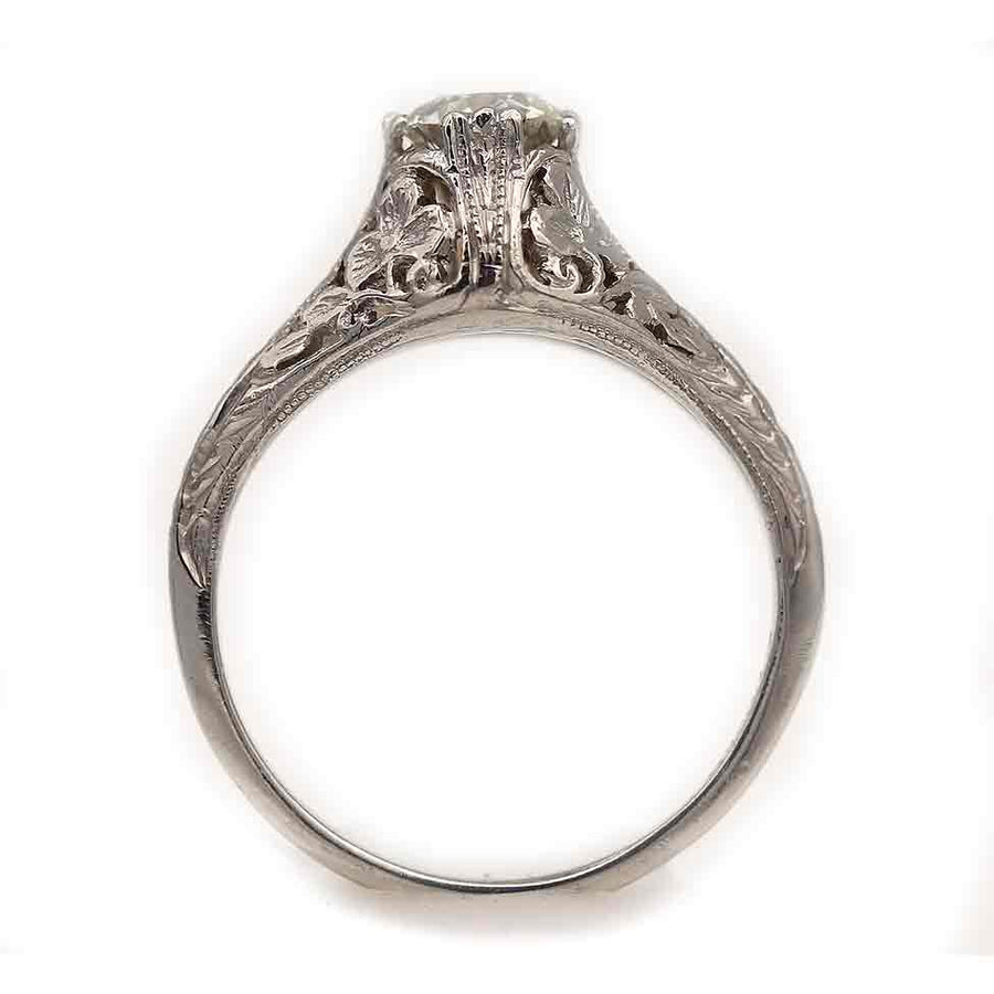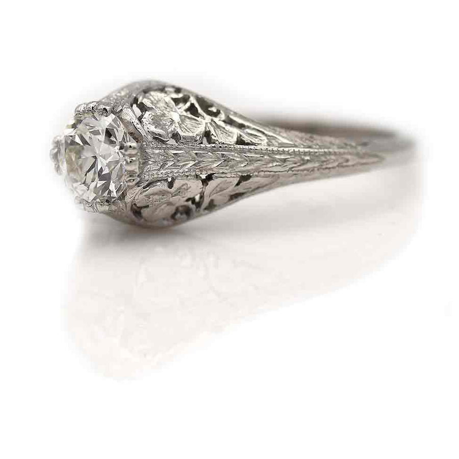 The Annie D ring is an authentic vintage engagement ring from the Art Deco era circa 1920's. The ring features a glittering .50 carat old European cut diamond of J color and Vs2 clarity. Beautifully crafted in platinum, accentuated with intricate filigree and floral engravings. A beloved vintage piece with beautiful engravings. In very good condition. They don't come any finer.