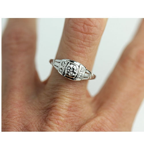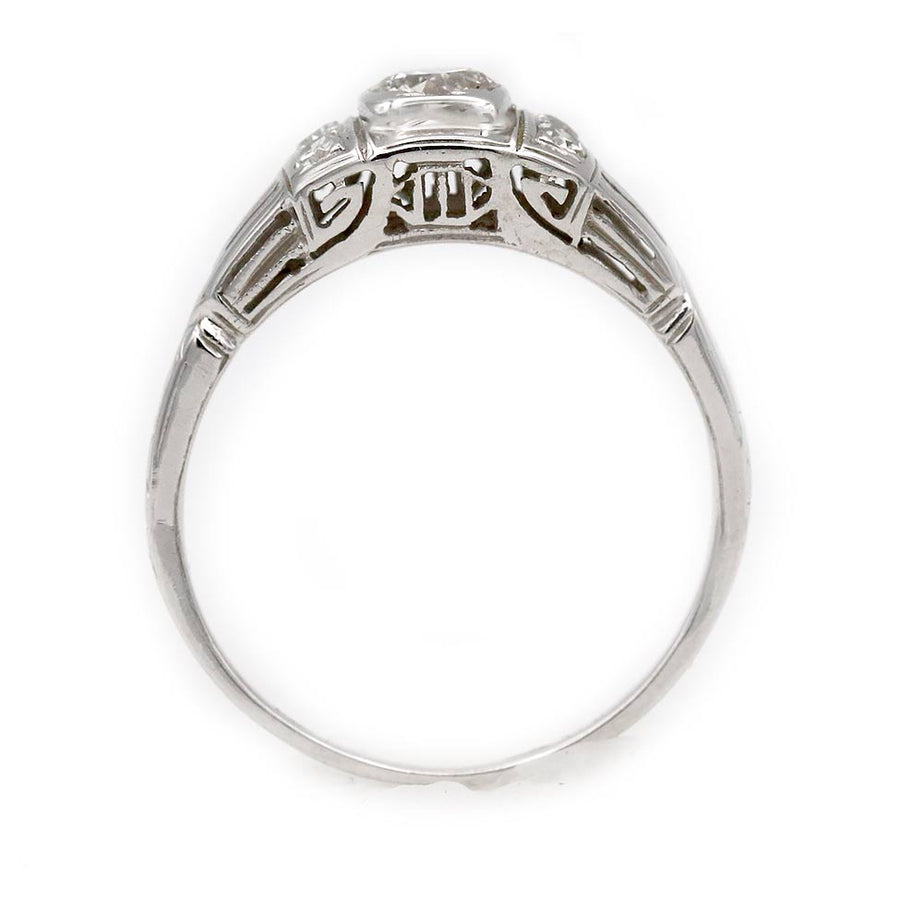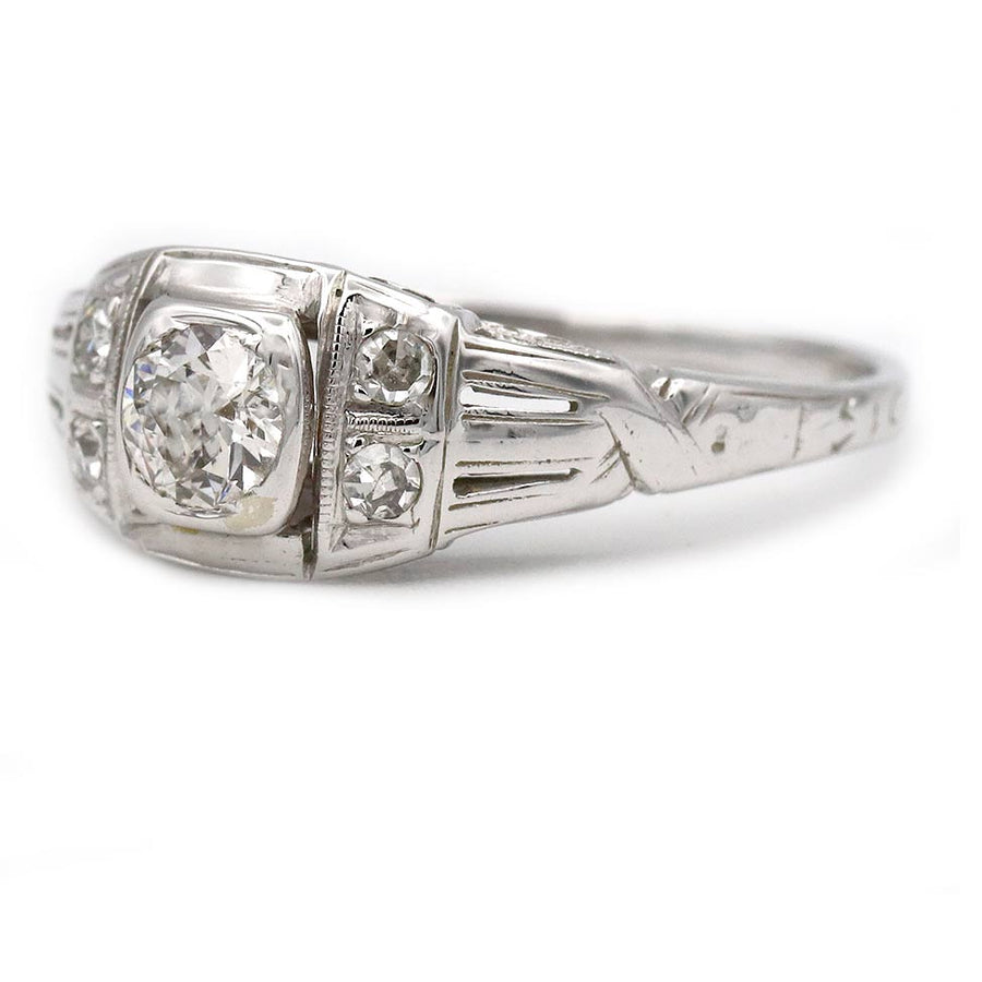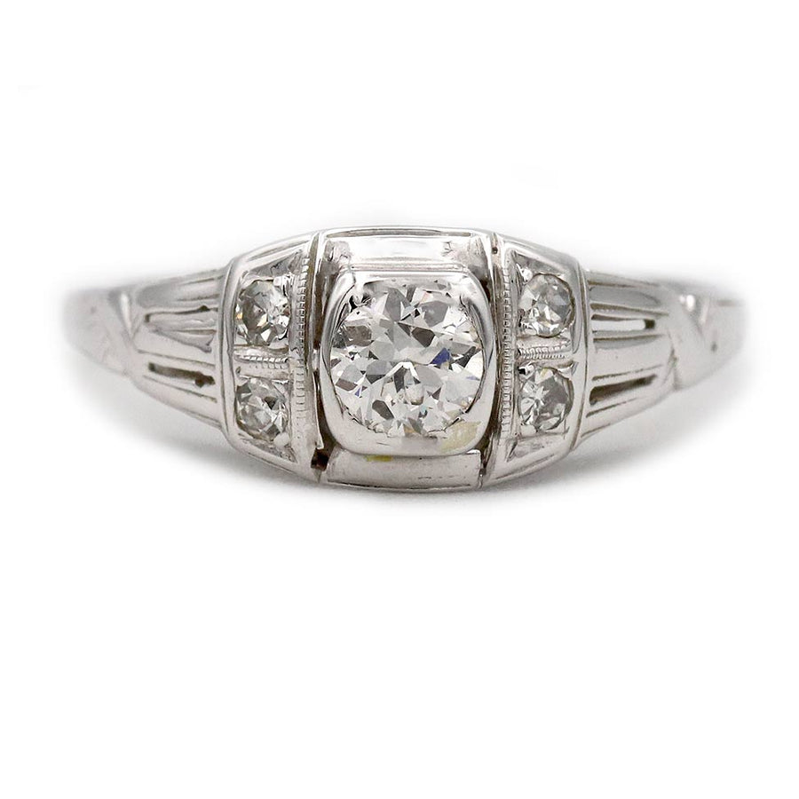 The Melinda ring is an authentic vintage engagement ring from the Art Deco era circa 1940's. The ring boasts a bezel set .45 carat old European cut diamond of I color, VS2 clarity. The diamond is flanked by 4 single cut diamond accents. Crafted in 18 karat white gold, accentuated with delicate milgrain engravings and open metal work. A crisp, clean original vintage ring. In very good condition.