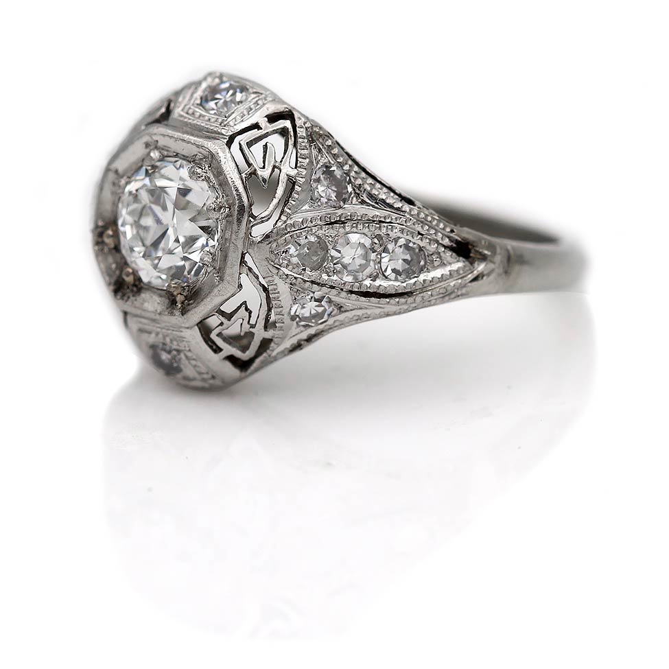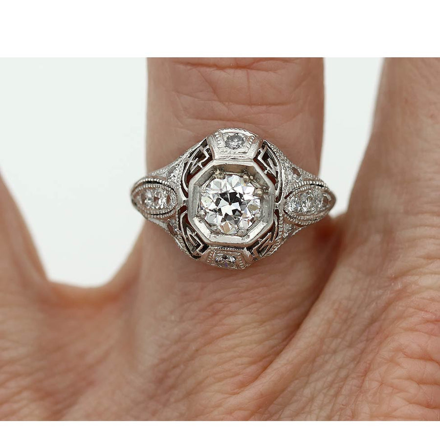 The Beta ring is an authentic vintage engagement ring from the Art Deco era circa 1920s. The ring boasts a GIA certified .53 old European cut diamond of G color, SI1 clarity, residing in a geometric octagonal frame. The diamond is surrounded by 10 single cut diamond accents. Crafted in platinum, accentuated with open metal work and beautiful filigree engravings. An amazing vintage piece, in excellent condition.