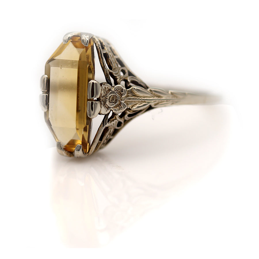 The Bushkin ring is an authentic vintage engagement ring from the Art Deco era, circa 1930's. This ring features a natural 1.50 carat rectangular cut citrine. Beautifully crafted in 14 kt white gold, and accentuated with floral engravings and open metal work, this is a lovely Art Deco piece! In very good condition.