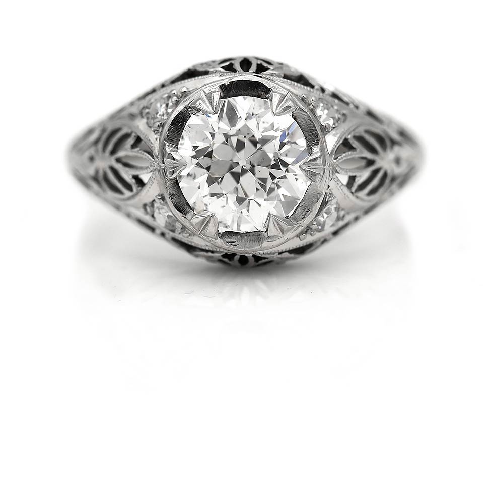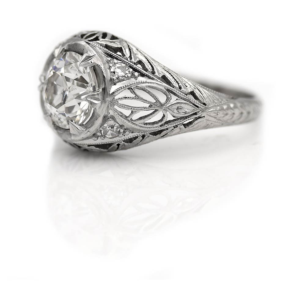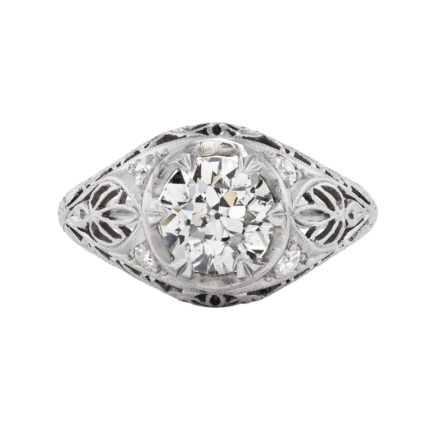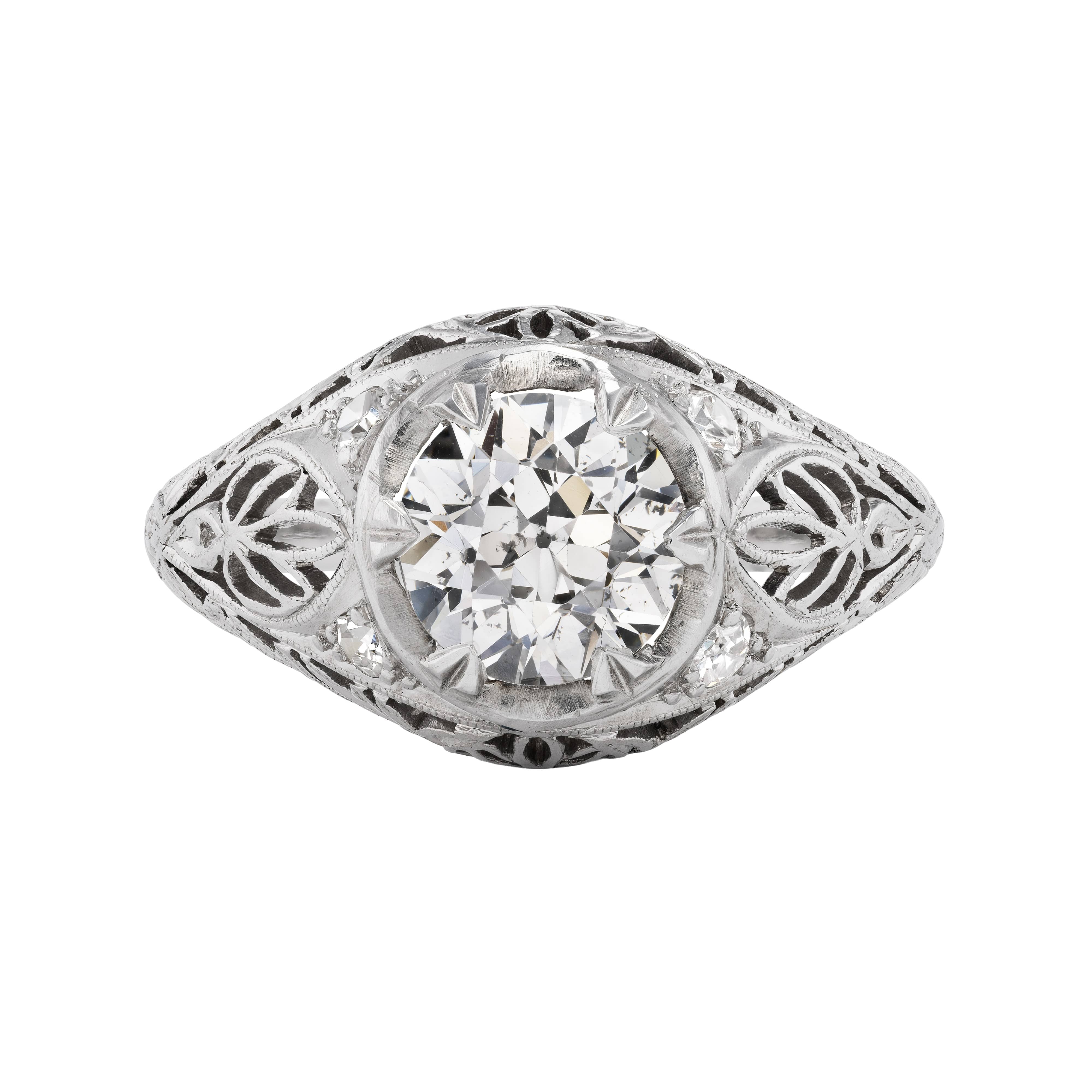 The Fannie B ring is an authentic vintage engagement ring from the Art Deco era, circa 1930's.  This ring features a beaming 1.71 carat GIA certified old European cut diamond of J color and SI2 clarity, surrounded by 4 single cut diamond accents. Beautifully crafted in platinum, accentuated with beautiful open metal work and intricate milgrain engravings. A rare Art Deco treasure, in very good condition.