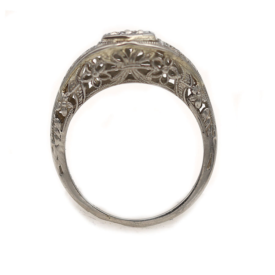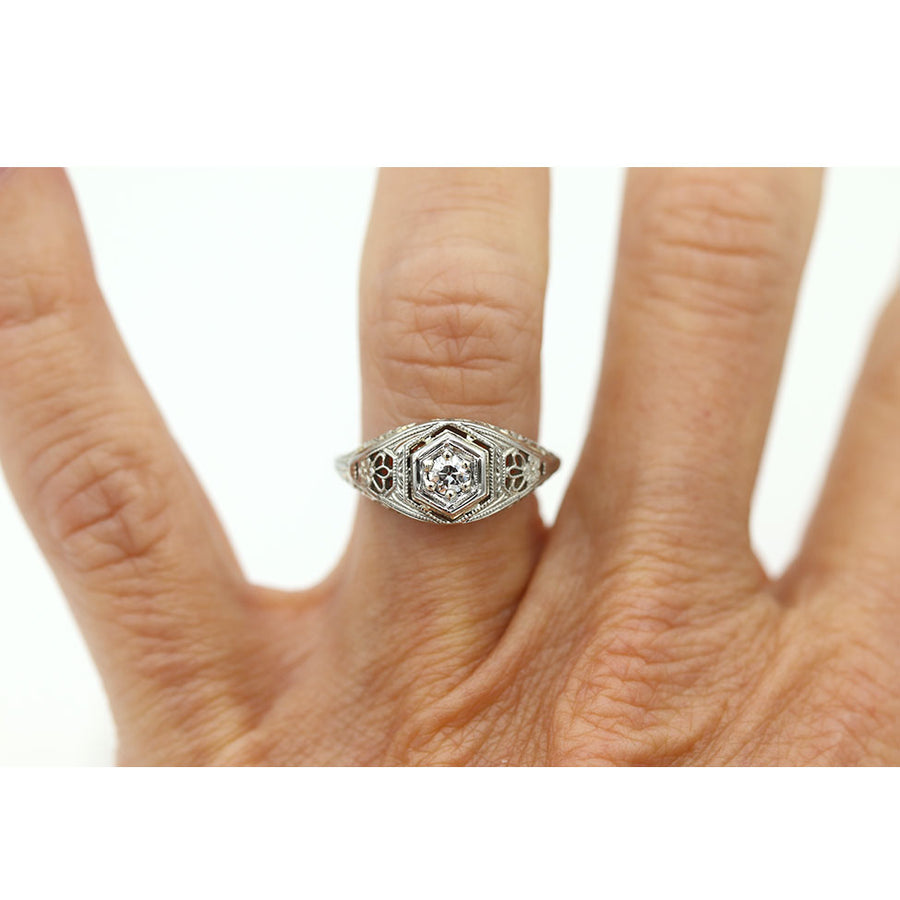 The Quill ring is an authentic vintage diamond engagement ring from the Art Deco era, circa 1930s. This ring features a .18 carat old mine cut diamond of F color and VS2 clarity, residing within a geometric hexagonal frame. Beautifully crafted in 18 kt white gold, and accentuated with open floral metal work and delicate milgrain engravings. A classic and timeless vintage piece, in very good condition.
