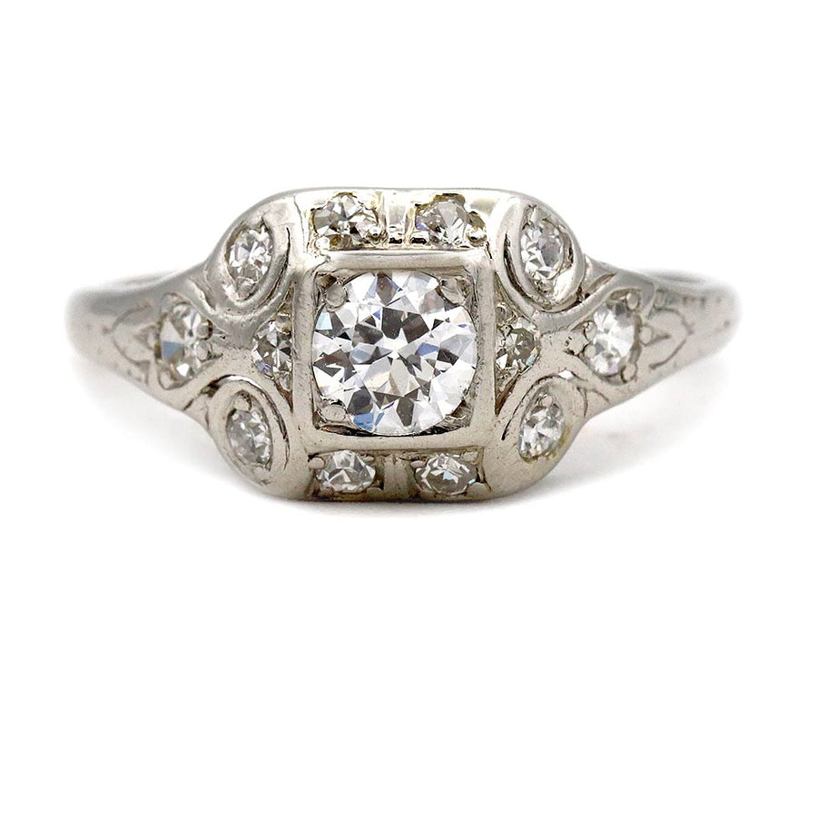 The Peggy Y ring is an authentic antique diamond engagement ring era circa 1930s. The ring boasts an AGI certified .60 carat old European cut diamond of G color, VS2 clarity, residing in a geometric square frame. The diamond is flanked by 12 bezel set single cut diamond accents. Beautifully crafted in platinum, accentuated with swirls of metal work. A rare, one of a kind Art Deco piece. In good condition.