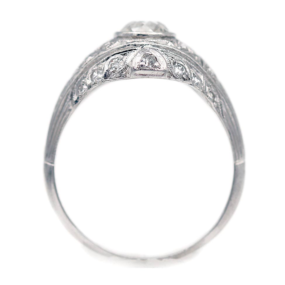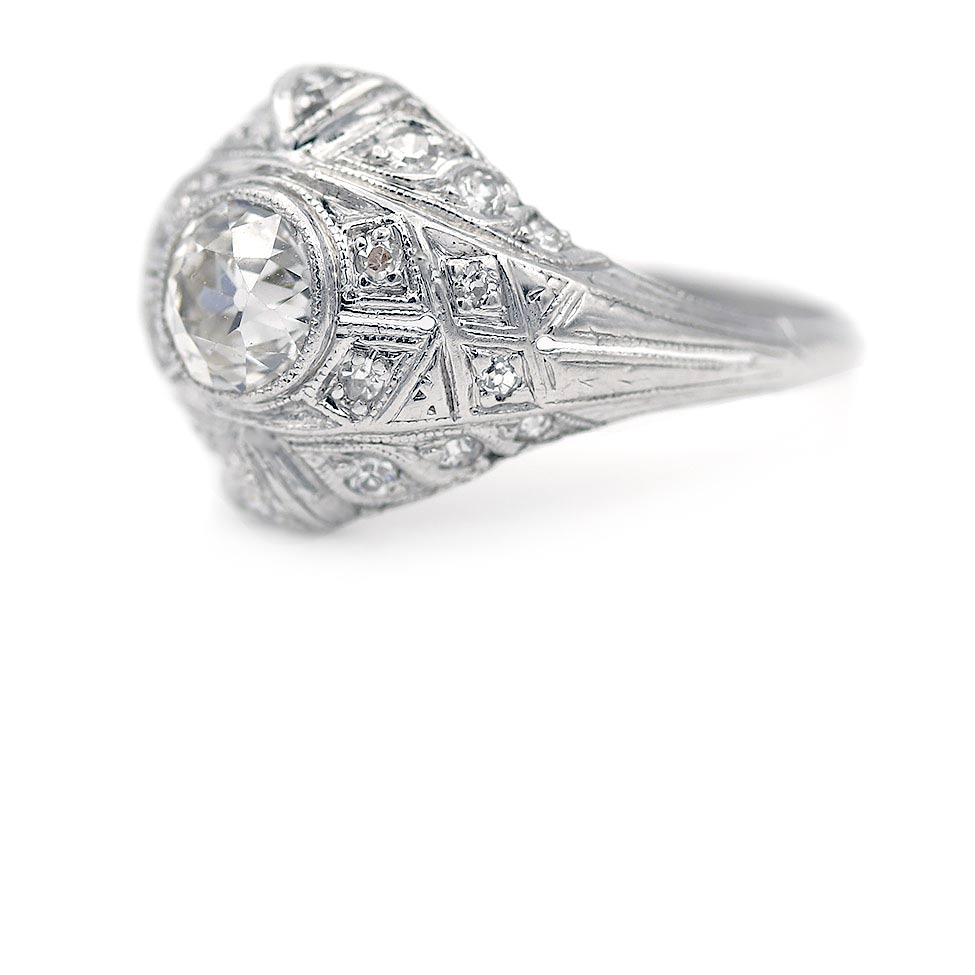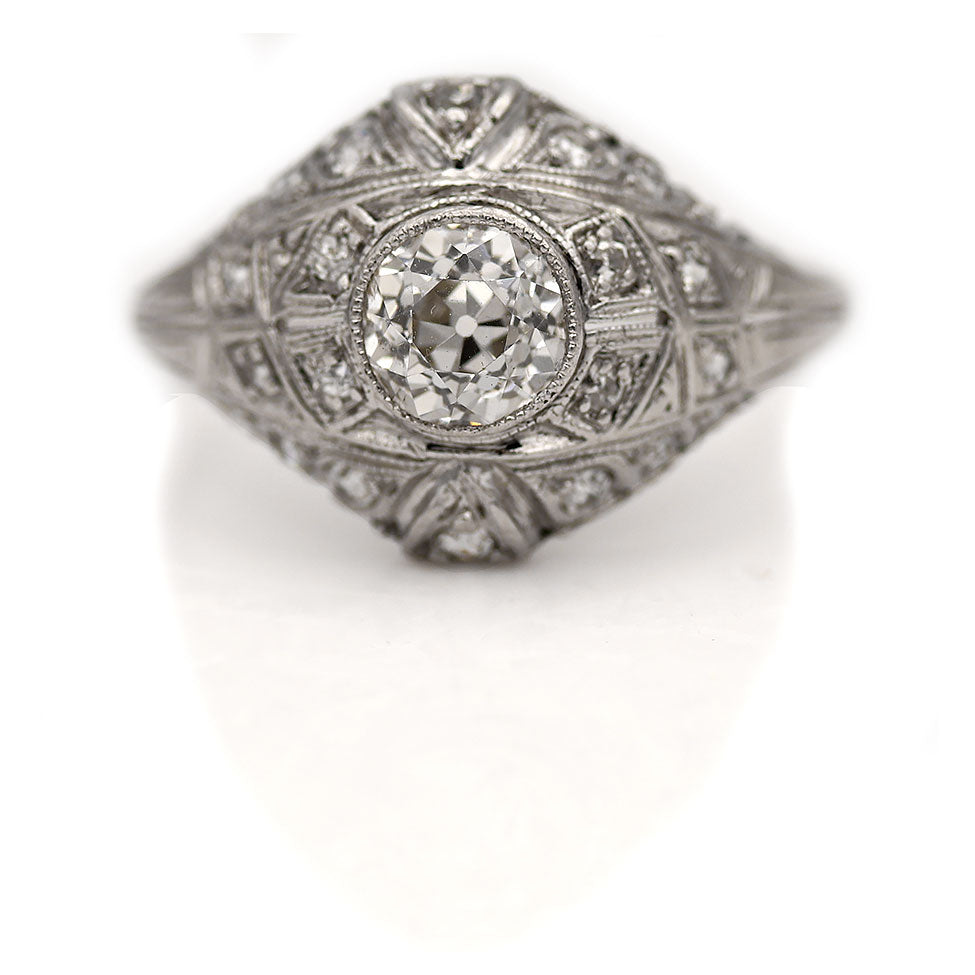The Kayla ring is an authentic vintage engagement ring from the Edwardian era circa 1920s. The ring showcases a glittering bezel set AGI certified H color, VS2 clarity .85 carat old mine-cut diamond. The diamond is surrounded by 22 single cut diamond accents. Crafted in platinum, accentuated with filigree and milgrain engravings. A stunning vintage treasure, in pristine condition.
