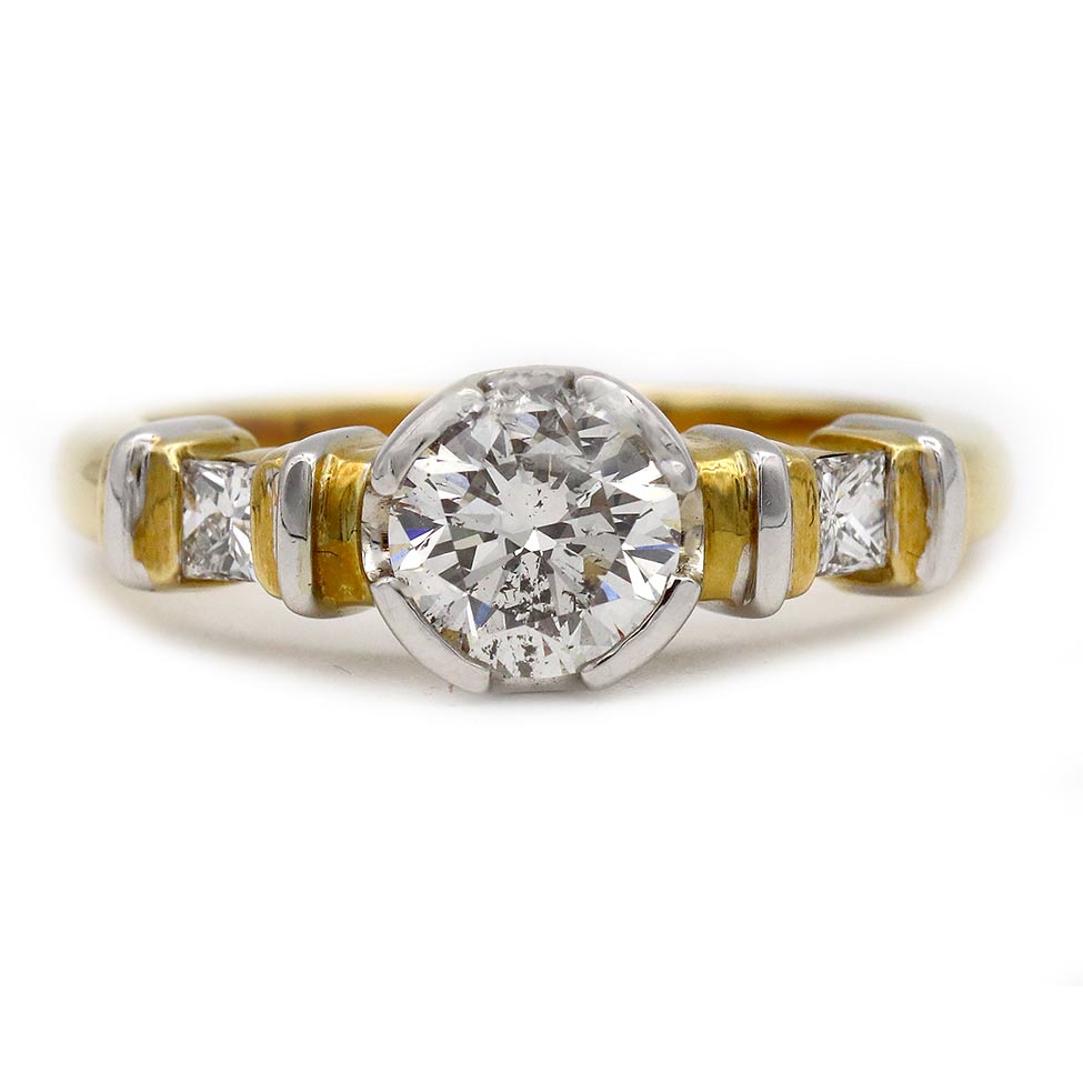 The Avi ring is an authentic vintage diamond ring from the 1980s. The ring boasts an AGI certified bezel set 1.01 carat round brilliant diamond of G color and SI2 clarity. The diamond is accented by 2 princess cut diamond accents. Crafted in 14 karat white gold interchanging with gleaming 14 karat yellow gold. A bold, sleek engagement, in very good condition.