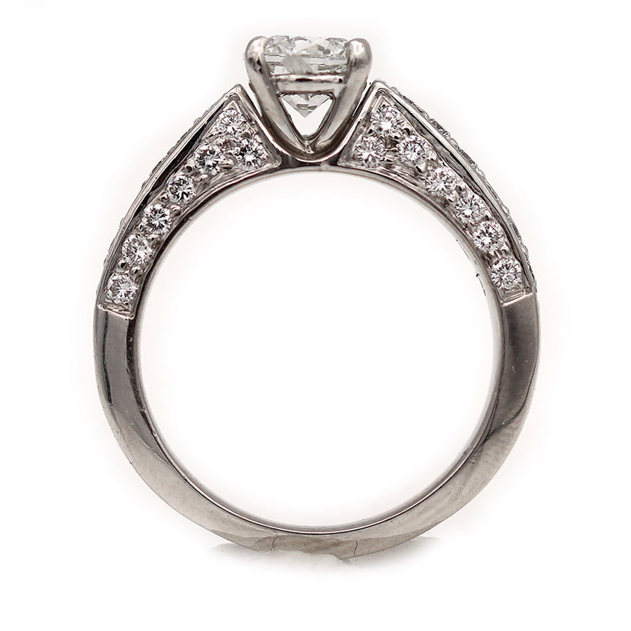The Tani ring is an authentic vintage engagement ring, circa 1990's. This ring features a .91 carat GIA certified round cut diamond of H color and SI2 clarity, surrounded by forty (40) pave set round cut diamonds. Beautifully crafted in 18 karat white gold. A classic ring, in very good condition.