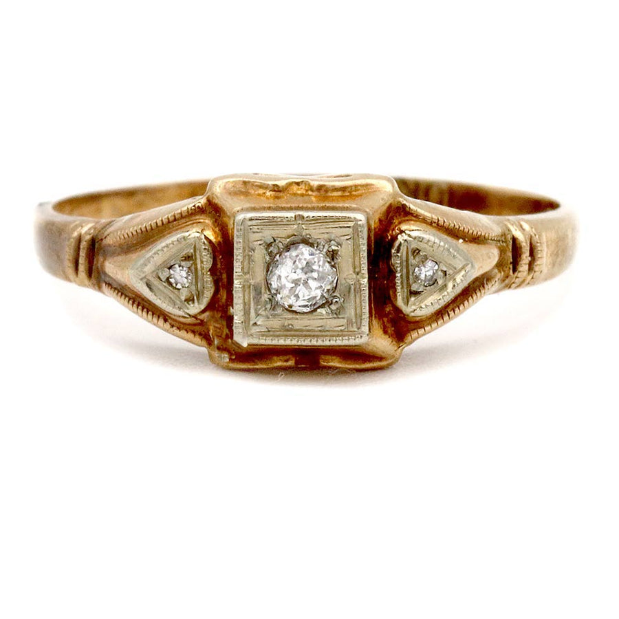 The Charlene ring is an authentic vintage diamond engagement ring dating to the 1950s. It features a bright white .10 ct old mine-cut diamond of H color and SI1 clarity, set within a geometric two-tiered square frame finished with delicate milgrain detailing. The center stone is flanked by two single cut diamond accents that add subtle sparkle and balance. Crafted with a 10K white gold basket atop a 10K yellow gold ring, the design is completed with delicate milgrain engravings. A clean, crisp, and classic Mid-Century engagement ring, preserved in very good vintage condition.