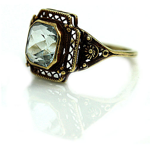 Pheluna features a bezel set placid blue 2.00 carat square cut aquamarine residing in an beautiful Art Deco engagement ring. This vintage gemstone resides in gleaming 14 kt rosy-yellow gold setting circa 1940's, finished with milgrain engravings and a latticework design. A perfect alternative engagement ring, in pristine condition.
