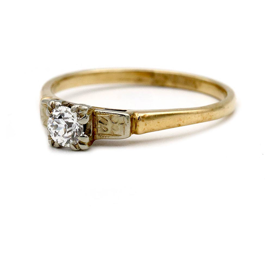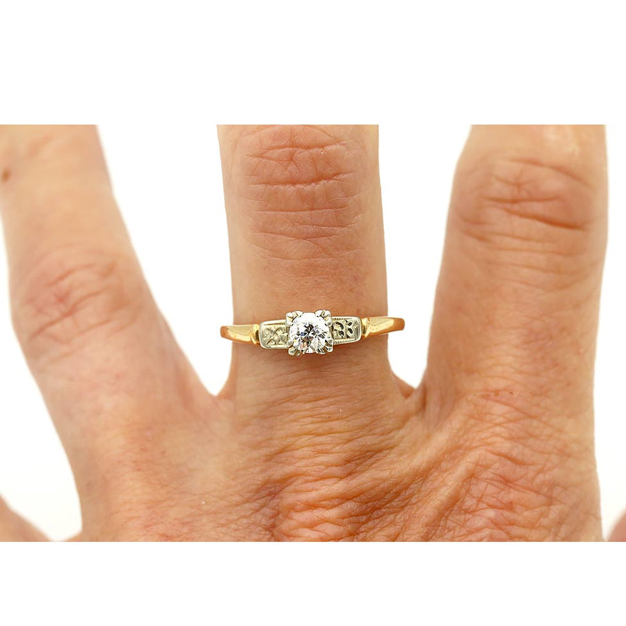 The Joelle ring is an authentic vintage engagement ring circa 1940s. The ring showcases a bright-white .35 carat old European cut diamond of H color and VS2 clarity, set within trefoil prongs. The diamond is flanked by intricate filigree engravings. Crafted in 14 karat white gold and a 14 karat yellow gold ring. Simply a lovely ring. In very good condition.